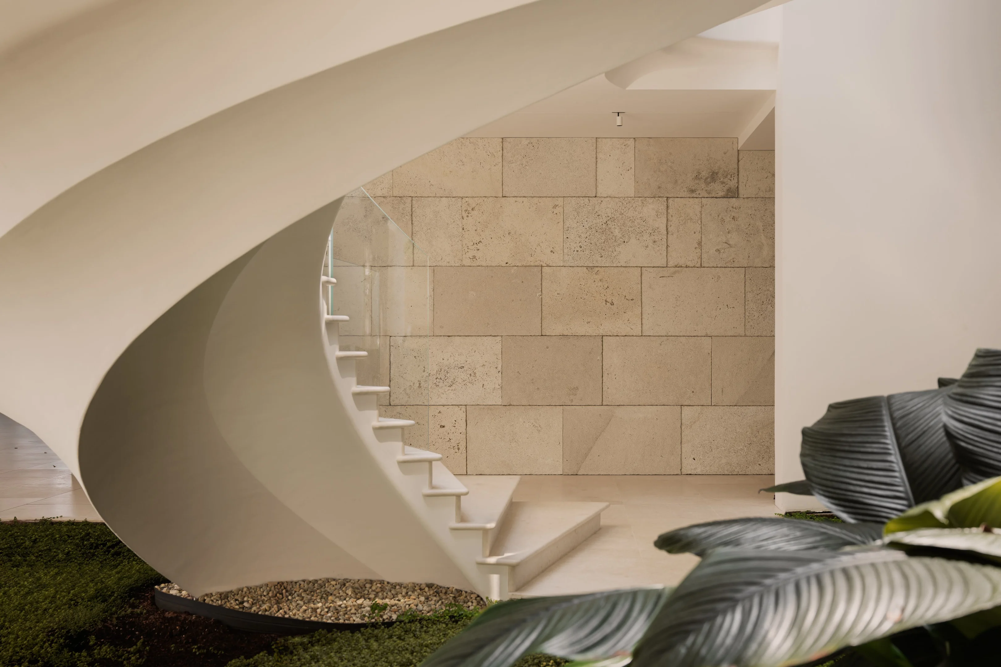 Das Herzstück der Villa bildet eine geschwungene Treppe aus Kanfanar Crema Kalkstein. Sie verbindet die Wohnbereiche mit den oberen Etagen und wird so zum zentralen Gestaltungselement des Hauses. Inspiriert von historischen Schlossarchitekturen, vereint sie klassische Eleganz mit moderner Präzision.