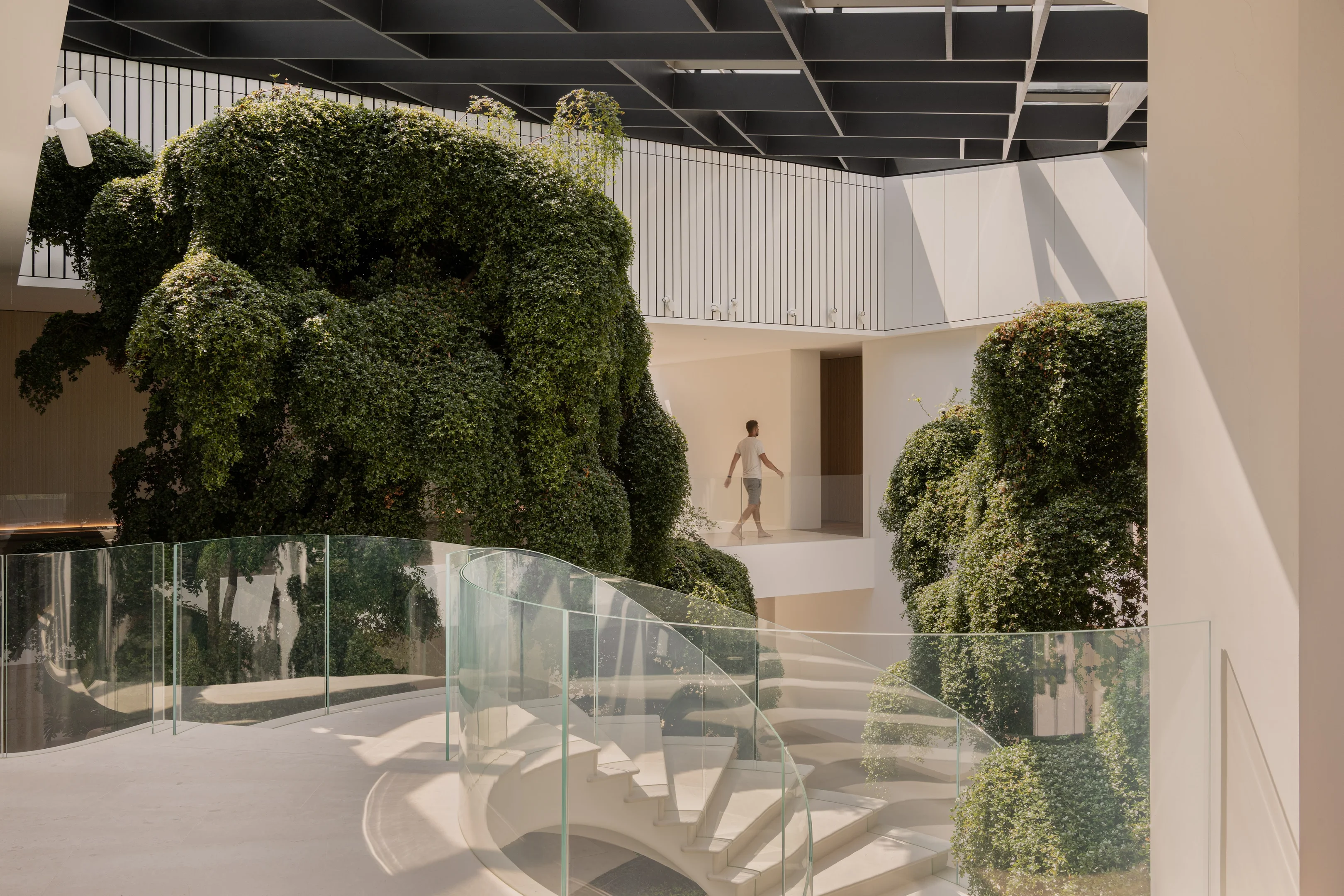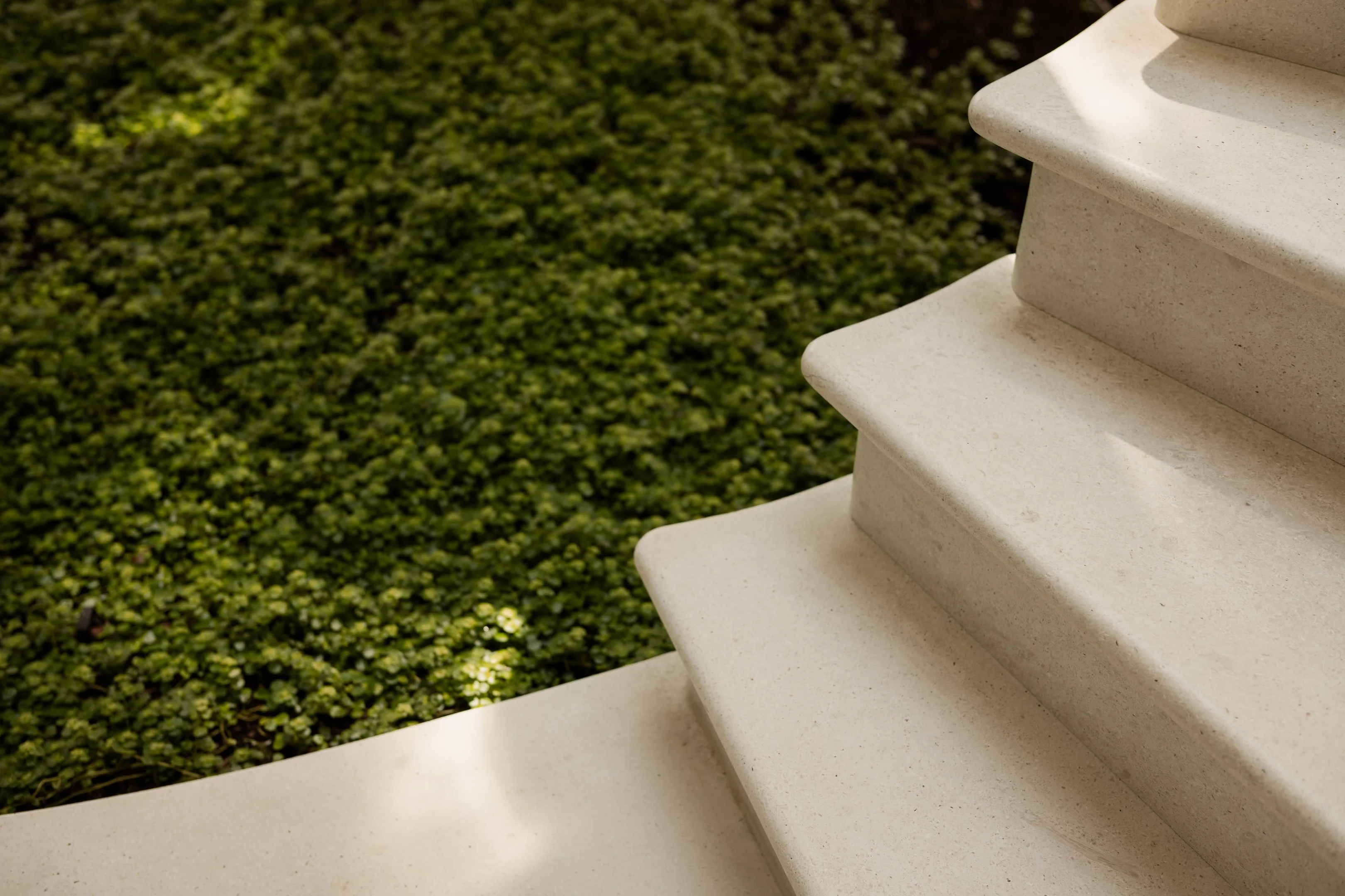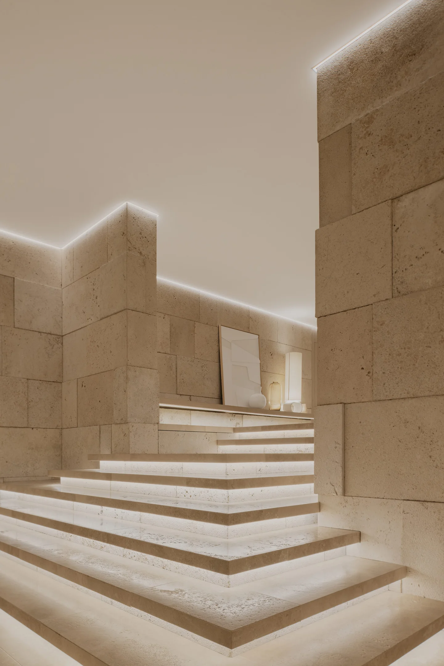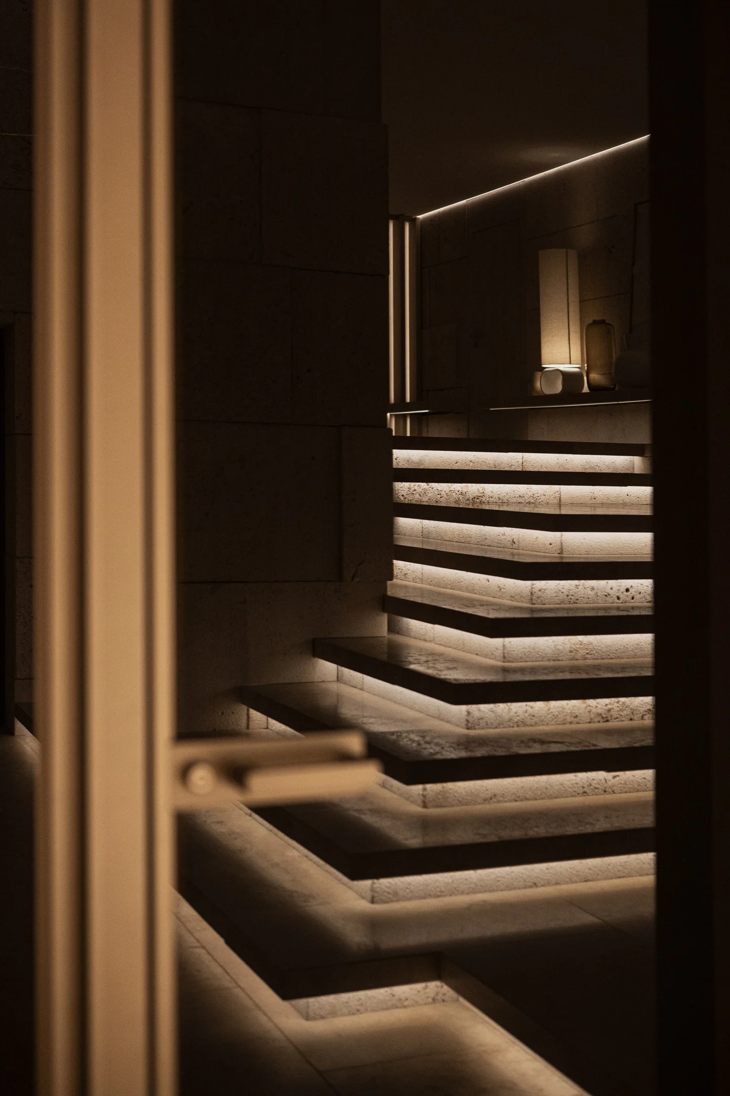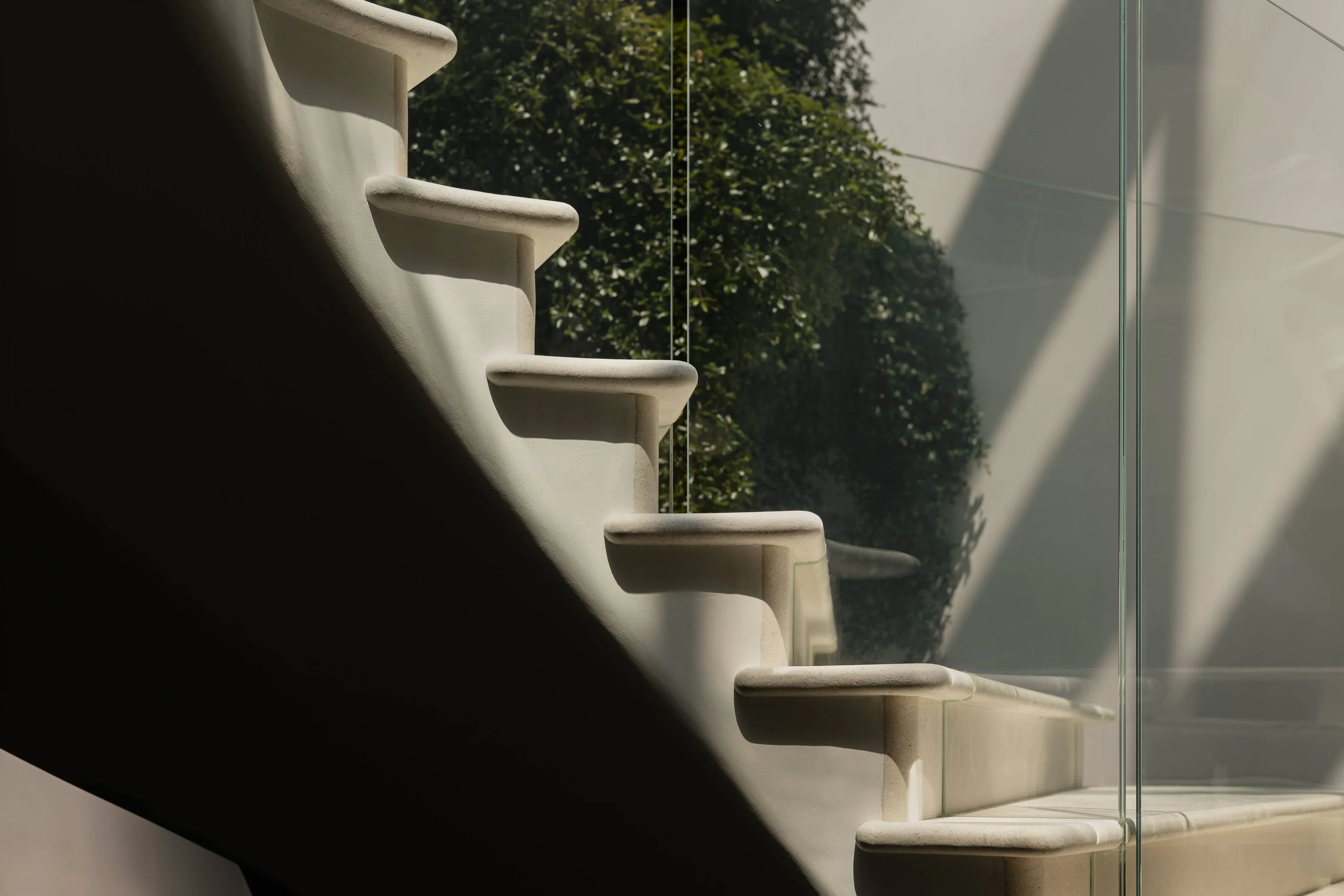 Die Umsetzung stellte hohe Anforderungen an Planung und Ausführung. Eine speziell angefertigte Schalung aus der Schweiz bildete die Grundlage für die komplexe Form. Besonders anspruchsvoll war die Integration großer, leicht grünlicher Glasscheiben, die exakt in den Naturstein eingefräst wurden. Das Zusammenspiel aus Licht, Glas und Stein verleiht der Treppe eine fast skulpturale Wirkung.