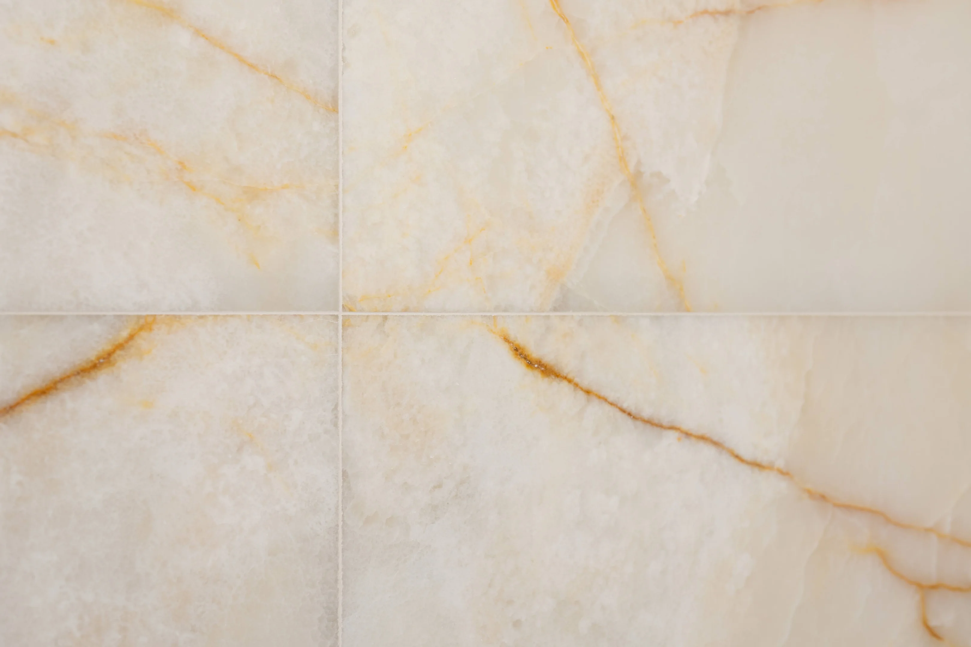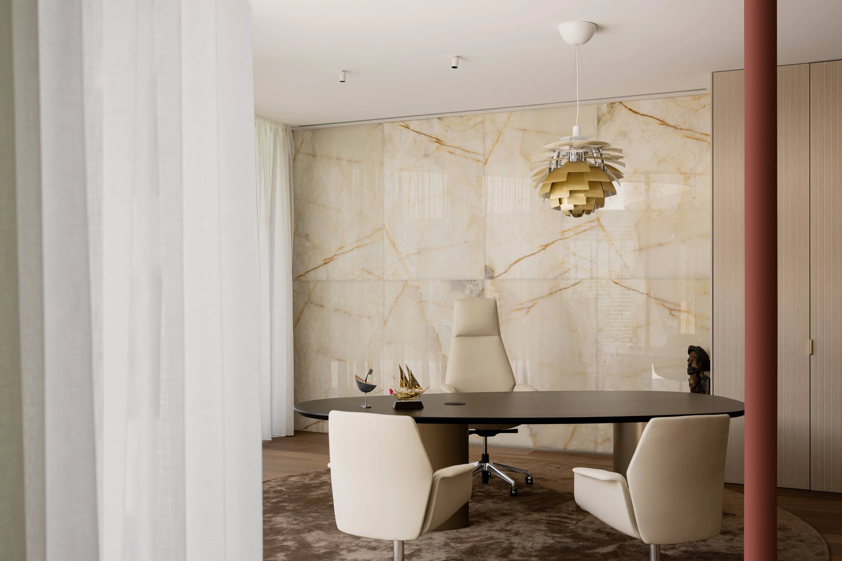 Auch in den weiteren Räumen setzt sich der Anspruch an Materialqualität konsequent fort. Im offenen Wohnbereich kommen großformatige Onyxplatten zum Einsatz, deren feine Maserung eine warme, natürliche Atmosphäre schafft. Die Kombination mit Kalksteinböden sorgt für ein harmonisches Gesamtbild.
