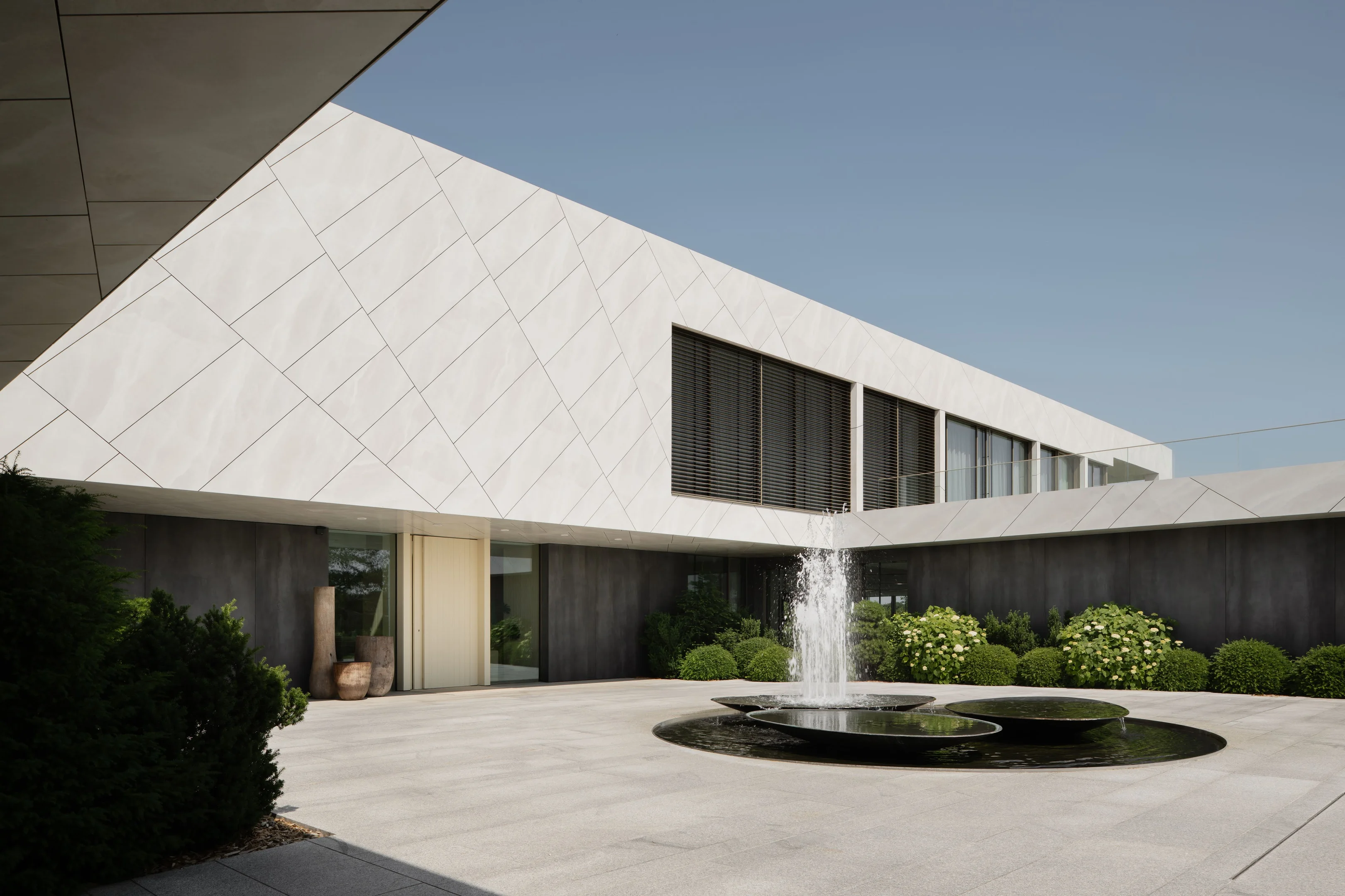 Die klare, moderne Architektur wird durch eine strahlend weiße Fassade aus Keramikplatten unterstrichen. Im Inneren zieht sich die Handschrift von stone4you durch alle Bereiche vom großzügigen Wohnraum über das Private Spa bis hin zum repräsentativen Eingangsbereich.