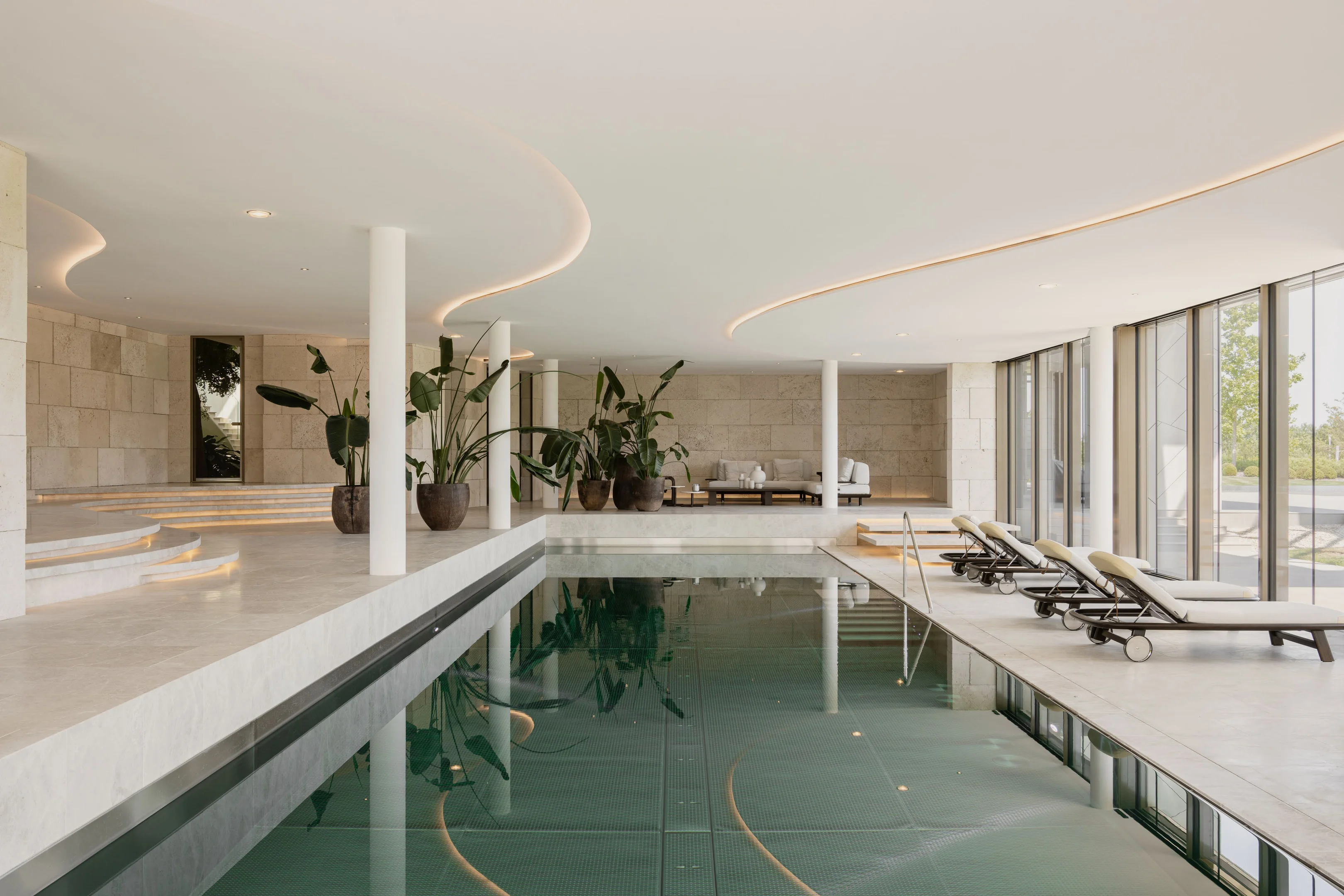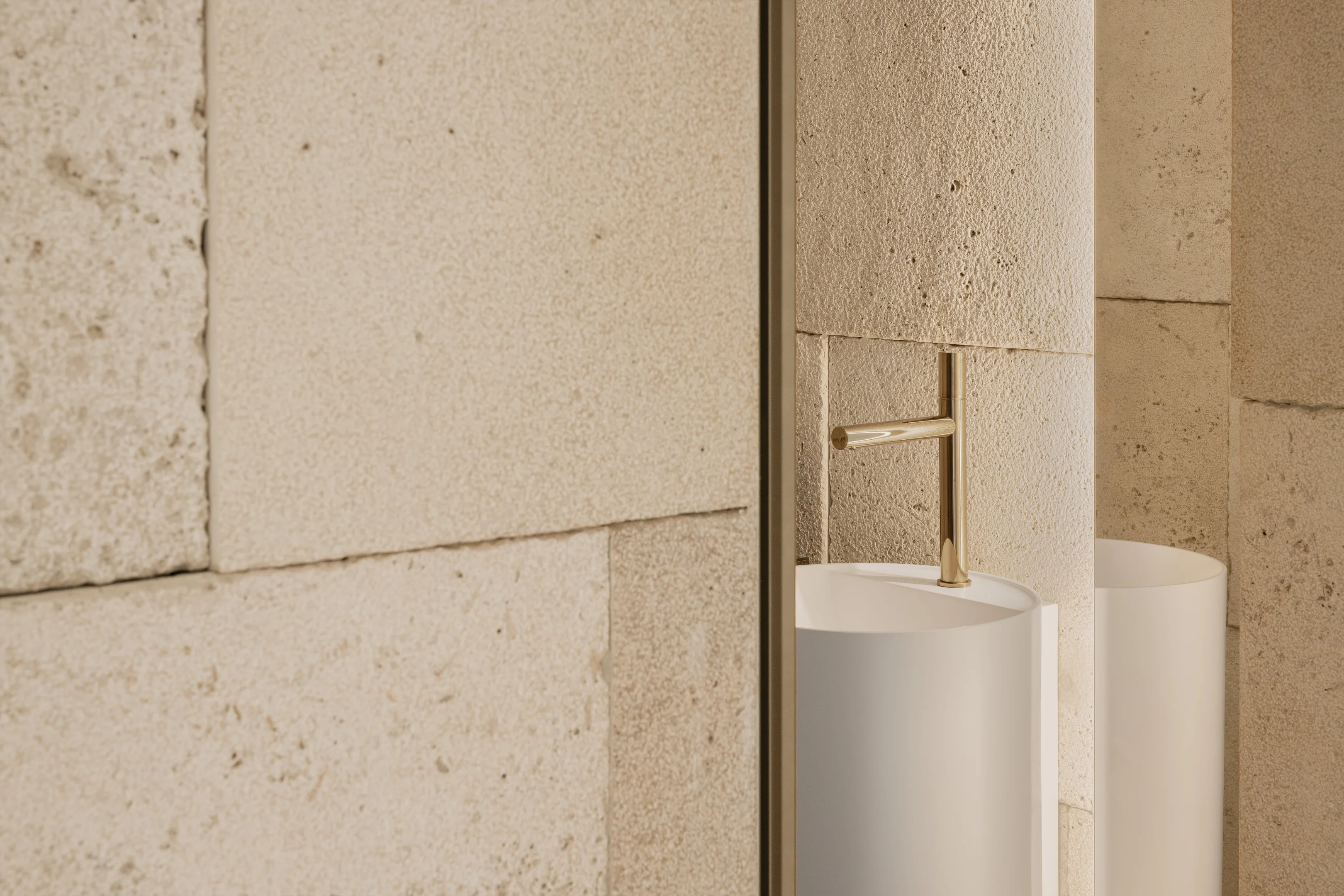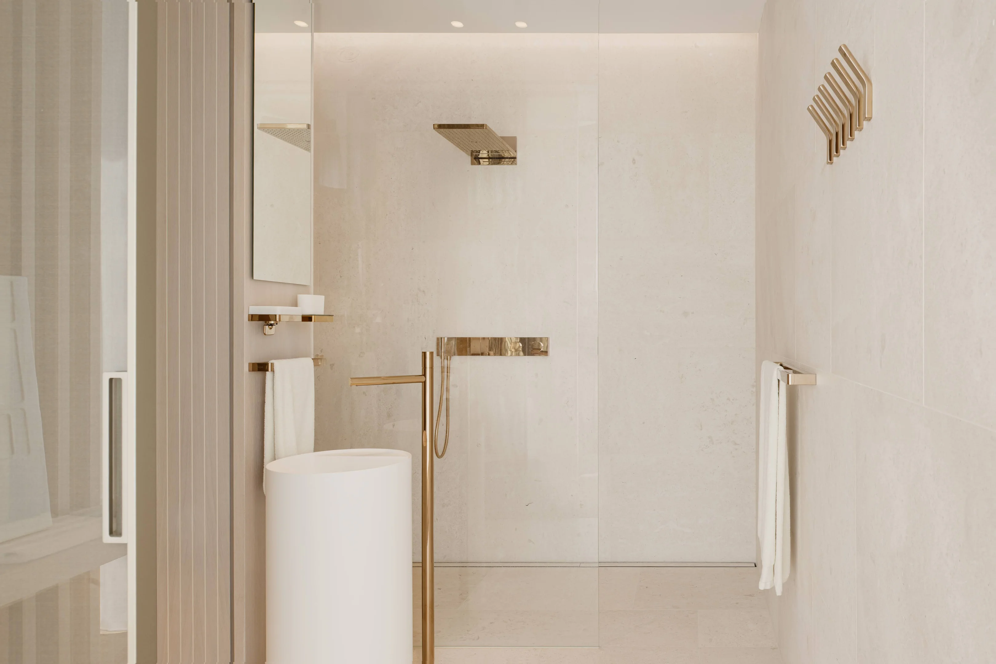 Das Badezimmer ist mit poliertem Calacatta-Marmor ausgestattet, dessen helle Oberfläche und dezente Struktur für zeitlose Eleganz stehen. Im Spa-Bereich wiederum dominiert Travertin, der mit seiner lebendigen Struktur mediterrane Akzente setzt. Unterschiedliche Plattenstärken erzeugen dabei eine reliefartige Wandgestaltung.