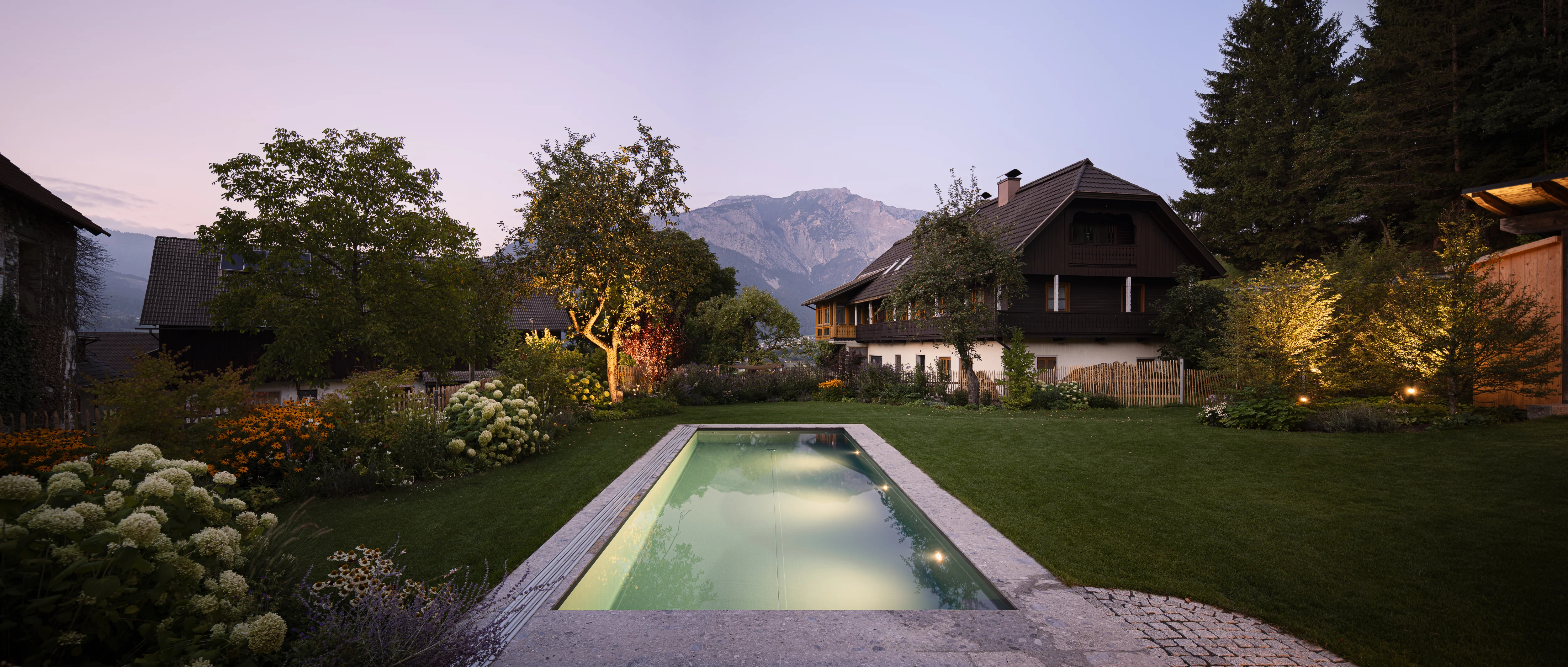 Diese Pflanzen setzen den gewünschten Blick auf den Dobratsch gezielt in Szene – unterstützt durch ein stimmiges Beleuchtungskonzept der Marke Flos. Mit viel Geschick und Feingefühl ist es Die BEGRÜNDER gelungen, dem Wunsch der Eigentümer nachzukommen, den Traumausblick in die Gartenarchitektur zu integrieren. Der Pool wurde daher bewusst mit seiner Längsachse in Richtung Bergkulisse ausgerichtet.