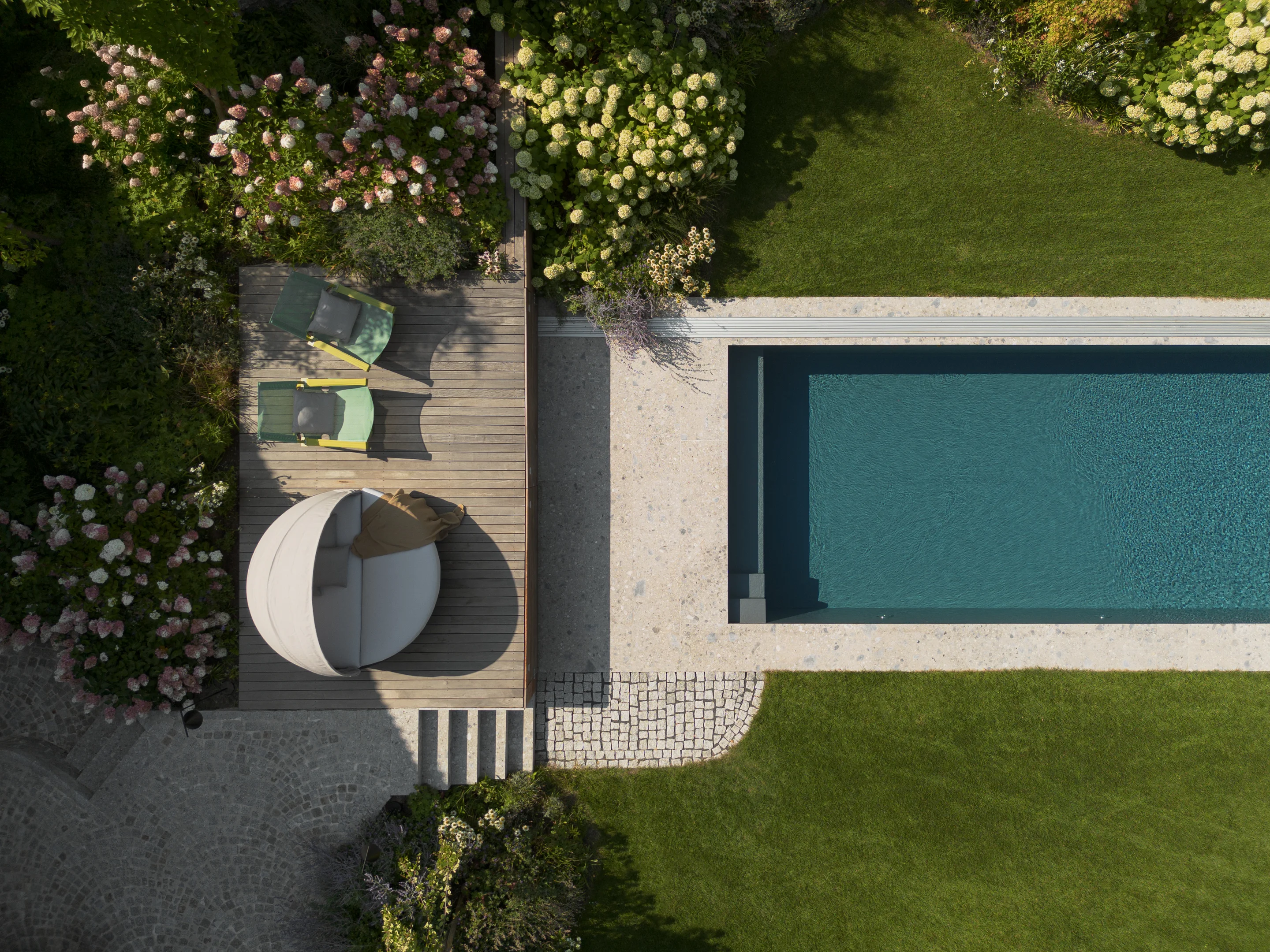 Passend zum ländlichen Ambiente wird der moderne Swimmingpool einerseits durch einen besonderen Naturstein aus der Region des Gardasees, andererseits durch eine natürliche Bepflanzung eingerahmt. Der polierte, leicht blau-graue Ceppo di Gré harmoniert perfekt mit den übrigen Pflastersteinen, während die daneben gesetzten Hortensien im Sonnenlicht fast zu tanzen scheinen und für weiche, lebendige Strukturen im Gartendesign sorgen.