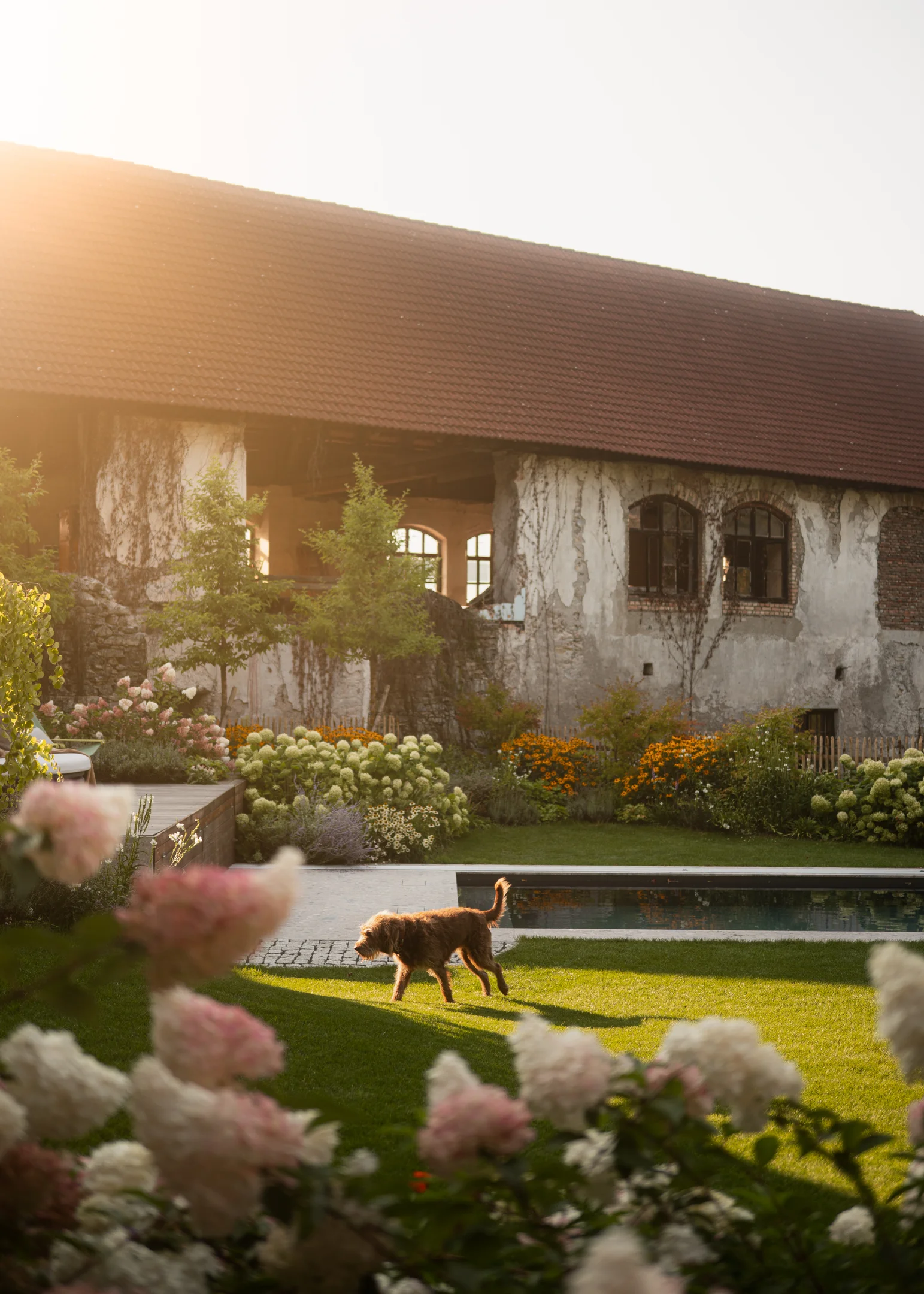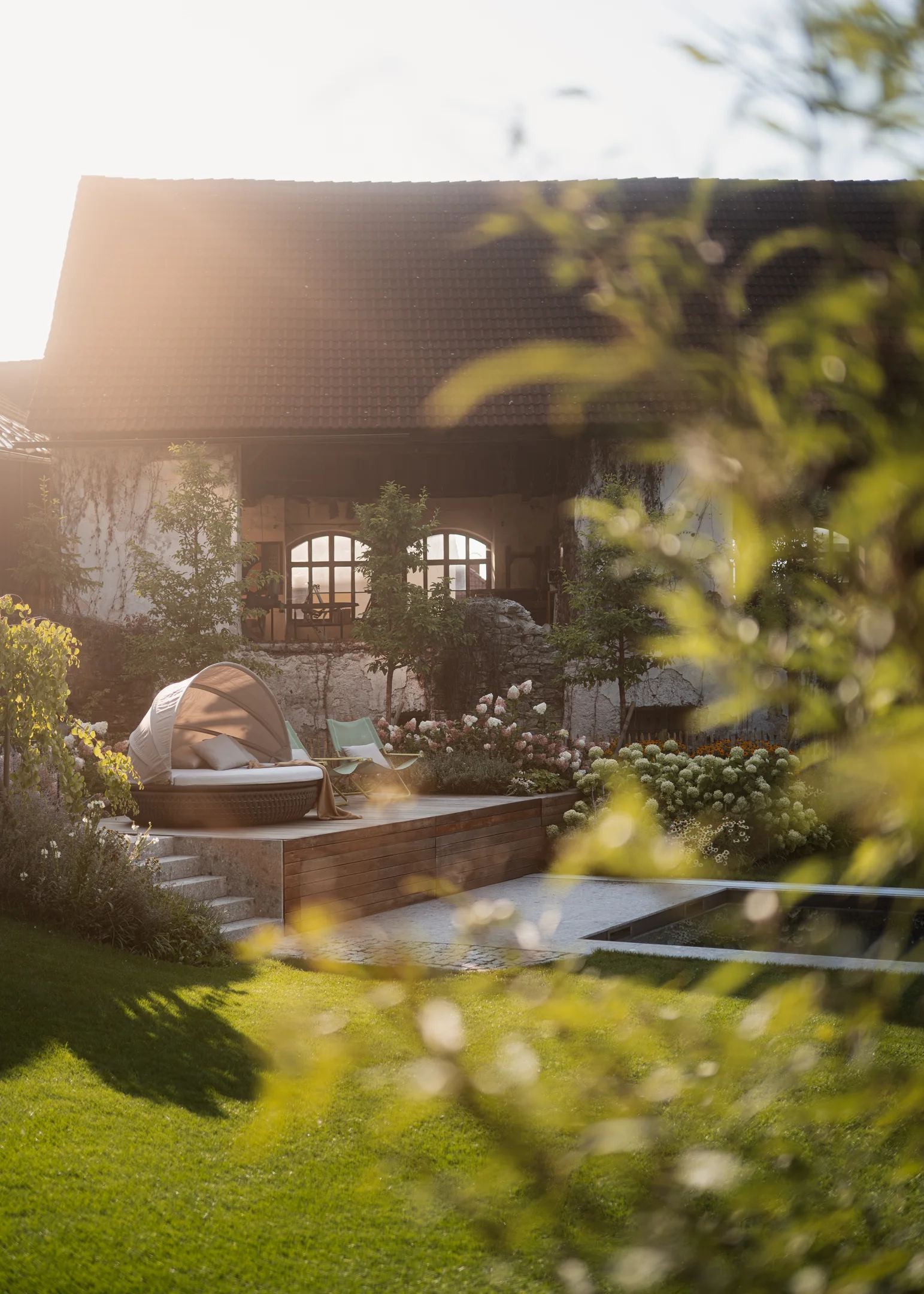 Mit viel Fingerspitzengefühl und Erfahrung wurde die natürliche Landidylle gemeinsam mit dem Anspruch an Ästhetik und Design harmonisch in Einklang mit der ländlichen Architektur gebracht. Herzstück des Anwesens ist ein von Grund auf renoviertes, altes Bauernhaus mit offener Scheune, die zu einem sehr intimen, uneinsehbaren Sitzplatz umgestaltet wurde.
