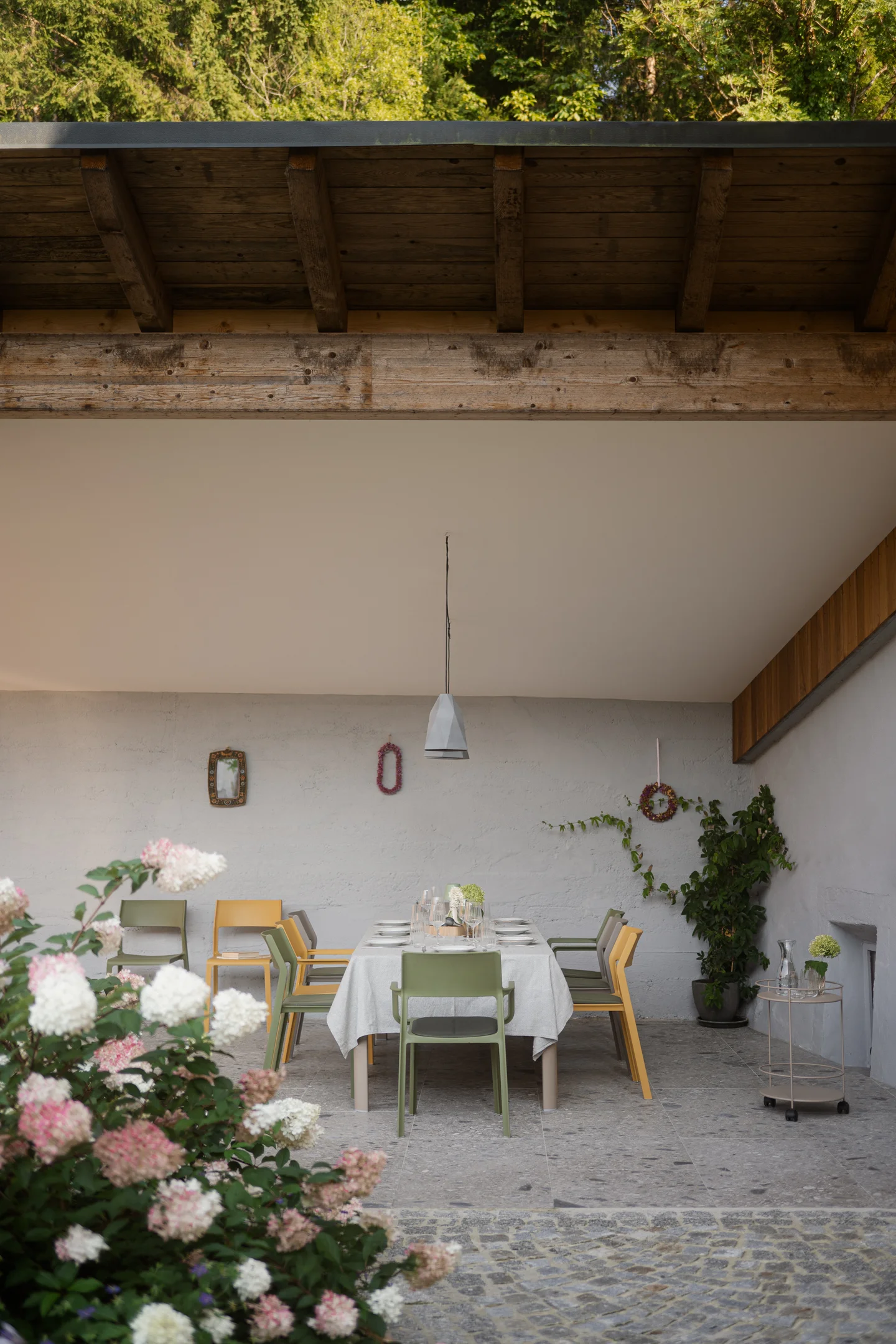 Die offene Scheune wurde zu einem herrlich ruhigen, vor Blicken geschützten Sitzbereich umgestaltet – ideal für Frühstück, Mittagessen oder entspannte Abende. So entstand ein Ort der Entschleunigung, der sich harmonisch zwischen Bestehendem und Neuem einfügt – sensibel umgesetzt, mit Respekt vor Ort, Haus und Natur.