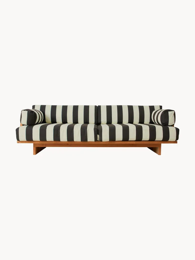 Die Basis für diesen Look entsteht immer im Zusammenspiel von Kontrast und Wärme. Reines Schwarz-Weiß kann schnell kühl wirken, weshalb natürliche Materialien eine entscheidende Rolle spielen. Besonders Teakholz bringt jene sanfte Wärme, die den Look ausbalanciert. Ein Outdoor-Hocker von HKLiving aus Teak etwa wirkt wie ein verbindendes Element zwischen Natur und klarer Gestaltung. Ähnlich funktioniert das Lounge-Sofa „Jass“ von House Doctor, das dunkle Linien mit hellen, soften Polstern kombiniert und so eine reduzierte, aber wohnliche Atmosphäre schafft. Auch das Gartensofa „Stracciatella“ aus Teak fügt sich in dieses Prinzip ein, indem es als ruhige, fast zurückhaltende Basis dient, auf der Kontraste erst richtig wirken können.