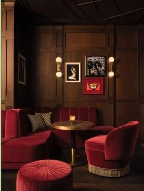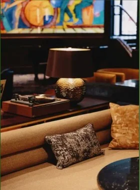 Das Interieur setzt auf eine dichte, opulente Gestaltung: Samt, Leder und kräftige Farbtöne bestimmen das Bild. Eklektische Möbelstücke und kuratierte Kunstobjekte erzeugen eine visuelle Spannung, die sich durch den gesamten Raum zieht.