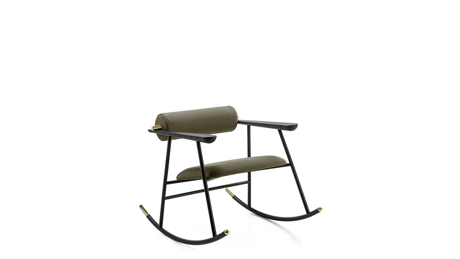 Auch der italienische Hersteller Gallotti&Radice setzt mit dem Loulou Rock auf die Kombination aus Metall und traditionellem Handwerk: Ein Schaukelstuhl mit schwarz lackierter Metallstruktur und Details aus poliertem Stahl oder Messing, die Armlehnen aus massivem Walnussholz. Das Unternehmen, das ausschließlich in Italien produziert, verbindet zeitgenössisches Design mit handwerklicher Präzision.