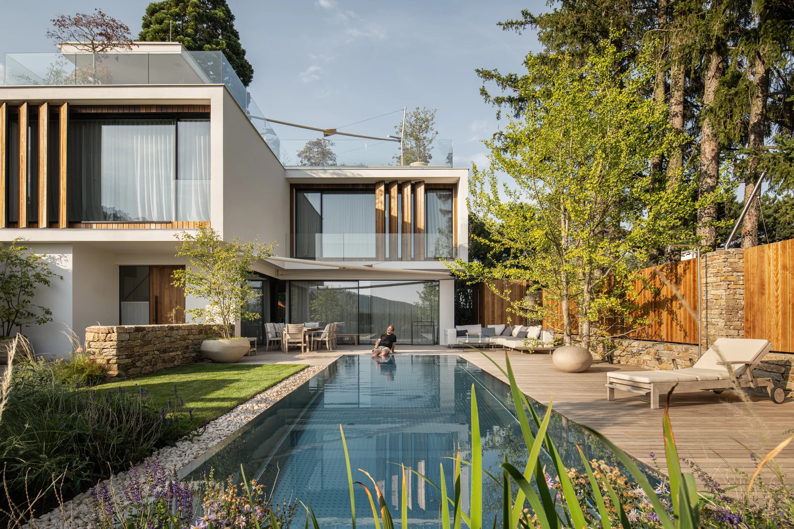 Ein Pool wird durch die passende Umrandung zum echten Highlight. Naturstein wirkt wie ein edler Rahmen, der den Pool optisch in Szene setzt. Entscheidend ist auch hier der Einsatz von unempfindlichen, pflegeleichten und rutschsicheren Natursteinen zur professionellen Pooleinfassung fürs ganze Jahr. Zudem bleibt im Gegensatz zu Beton oder Fliesen Naturstein selbst an heißen Sommertagen angenehm begehbar und heizt sich nicht übermäßig auf. Alle hochwertigen Natursteine sind frost- und witterungsbeständig, widerstehen Chlor- und Salzwasser und bleiben über Jahre hinweg schön und stabil. Von mediterranen Sand- und Kalksteinen bis hin zu modernen Granit- oder Basaltvarianten – der Stein passt sich jedem Pooldesign an und lässt sich mit Holzdecks oder Begrünung ebenso optisch wunderschön kombinieren.