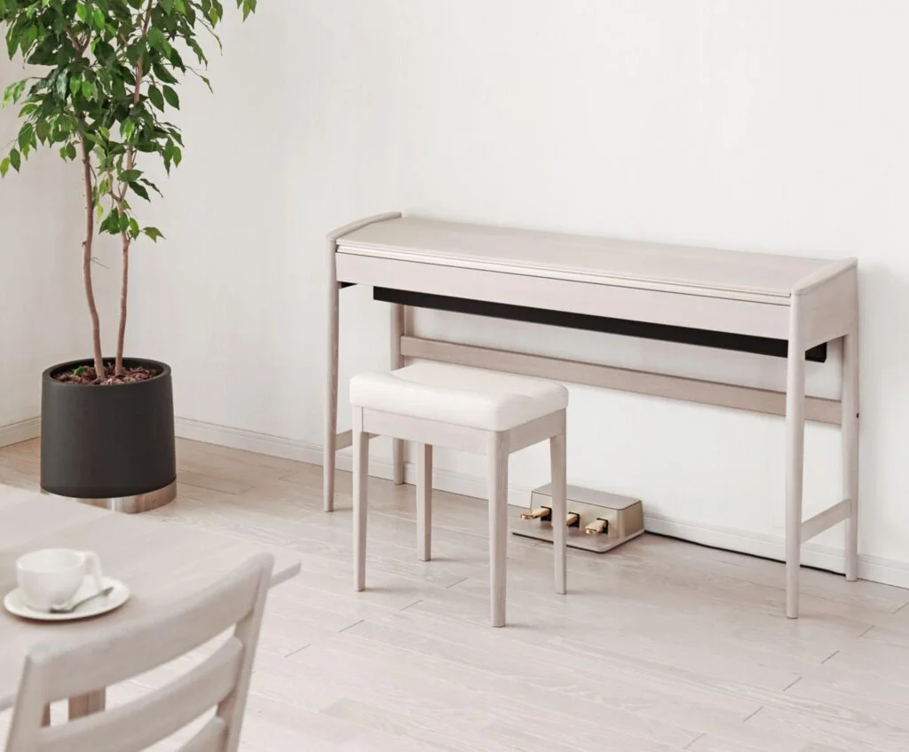 Das Roland Kiyola KF-10 ist ein weiteres Beispiel für die Verbindung von Möbel- und Instrumentendesign. Die sanften Holzoberflächen und die klare Formensprache lassen das Piano wie ein hochwertiges Sideboard erscheinen. Gleichzeitig sorgt die integrierte Roland-Technologie für ein authentisches Spielgefühl und präzisen Klang.