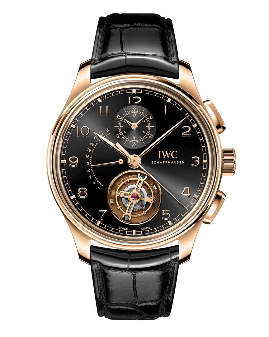 Die neue IWC Portugieser verfügt über ein 43,5-mm- Gehäuse aus Armor Gold, ein fliegendes Minutentourbillon und einen Flyback- Chronographen. Das Obsidian-Zifferblatt wird in 15 Lackschichten gefertigt.