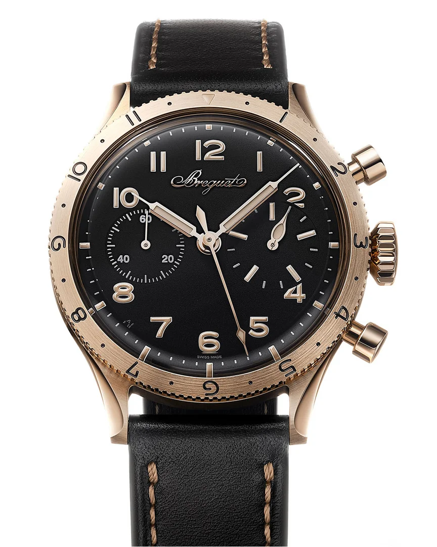 Anlässlich des 250-jährigen Jubiläums bringt Breguet die Type XX Chronographe 2075 heraus. Die Uhr erinnert an das Modell von 1955. Blickfang: das schwarze, anodisch oxidierte Aluminium-Zifferblatt.