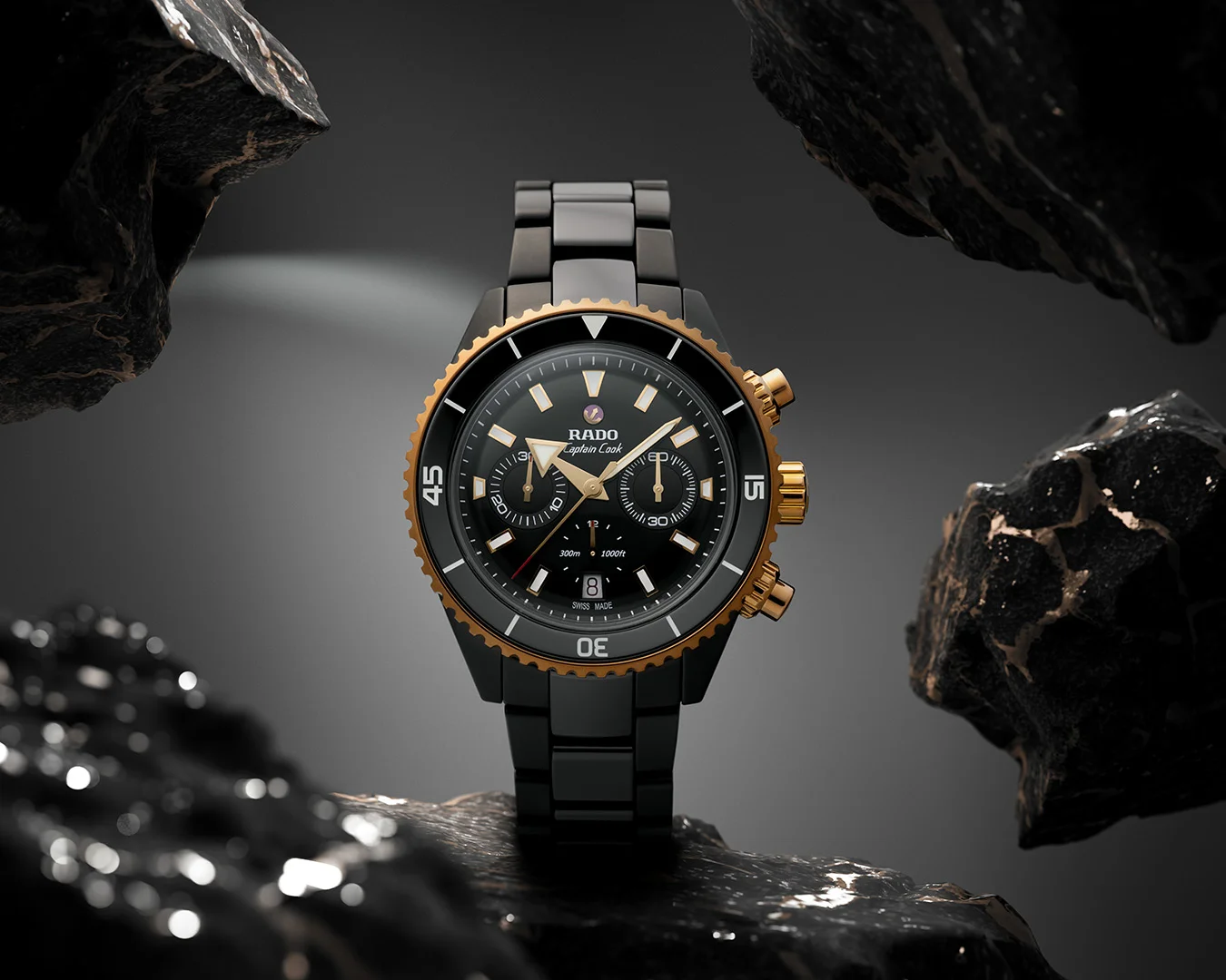 Erstmals verfügt ein Captain Cook-Chronograph über ein Monobloc-Gehäuse aus Hightech-Keramik. Mit Keramiklünette, Saphirglas und verschraubter Krone ist die Taucheruhr bis 300 Meter wasserdicht.