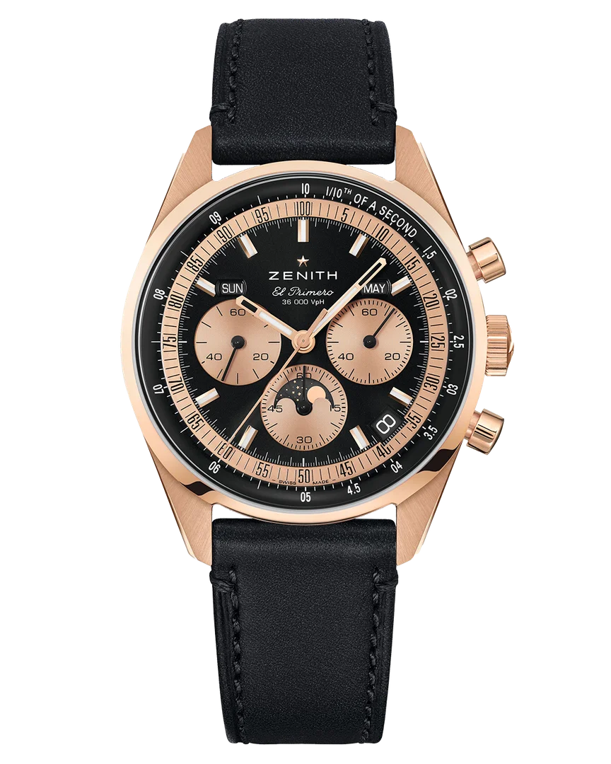 In Anlehnung an ein klassisches Zenith- Modell aus den 1970ern bietet die Chronomaster Vintage Triple Calendar Chronograph, drei Totalisatoren, Kalender und Mondphase in einer stilvollen Goldversion.