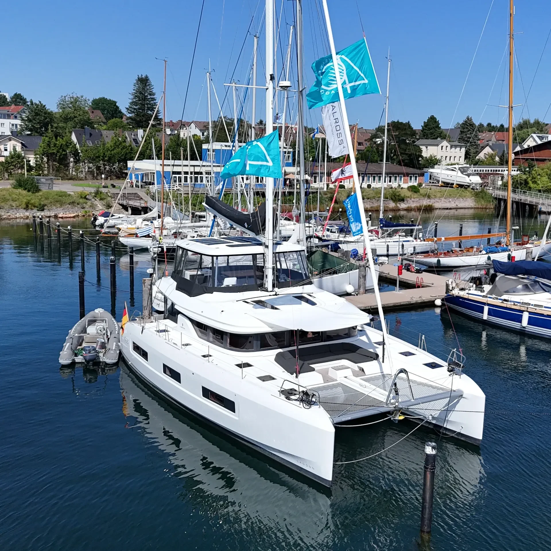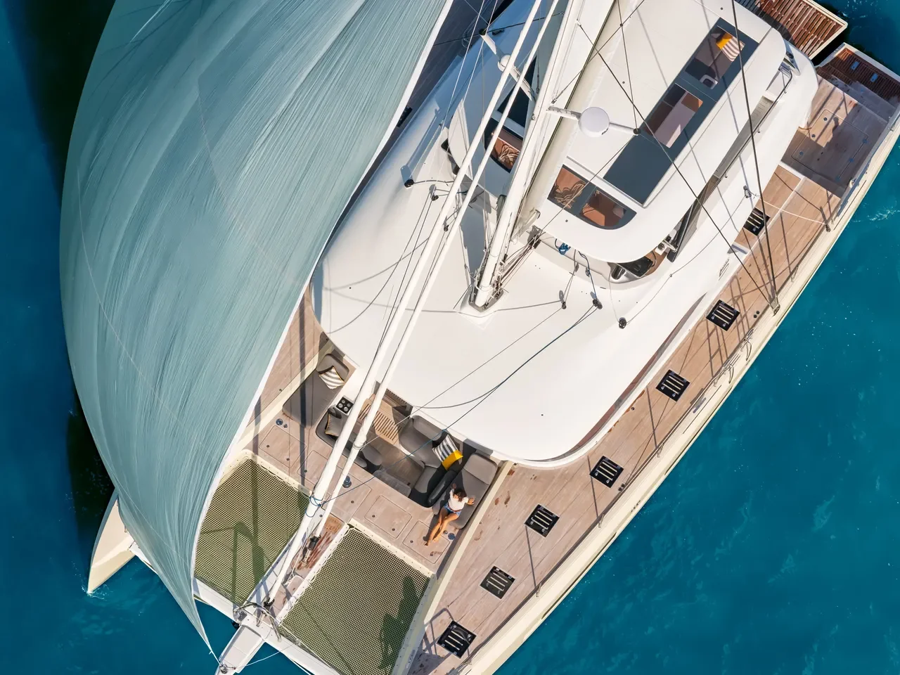 Auch an Deck zeigt sich der Anspruch, mehr aus der Größe herauszuholen. Loungebereiche am Bug, Sonnenflächen am Dach und ein erhöhter Steuerstand bringen Elemente größerer Katamarane in dieses Segment. Gleichzeitig bleibt die Yacht einfach zu segeln, unter anderem durch die serienmäßige Selbstwendefock und die Möglichkeit, zusätzliche Segel wie Code 0 oder Gennaker zu nutzen.