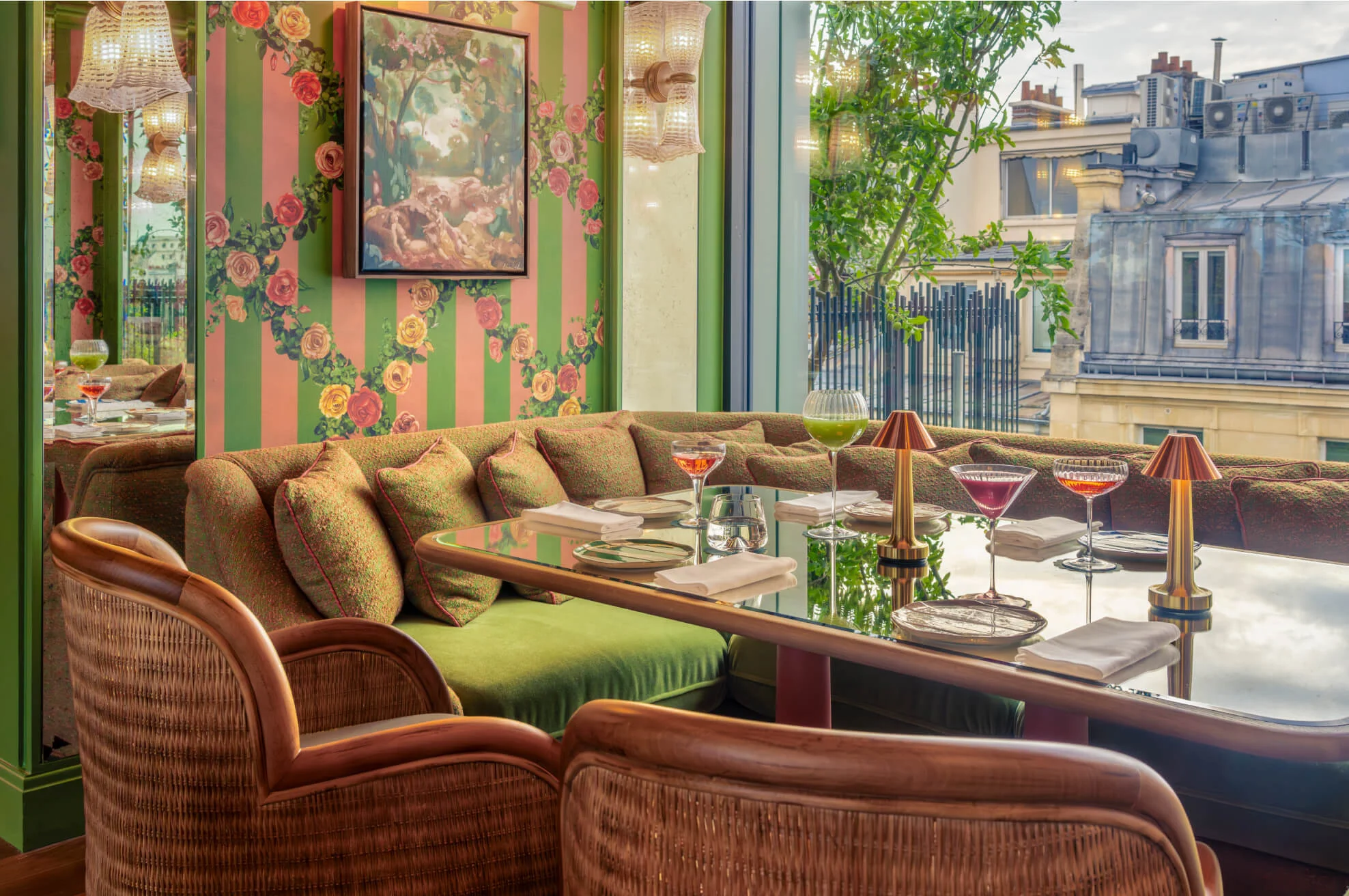 Im Inneren entstehen Räume, die fast wie urbane Gärten wirken. Warme Farben, florale Muster, viel Grün und sanftes Licht schaffen eine entspannte, poetische Atmosphäre. Die Bar wirkt nicht wie ein klassischer Hotelraum, sondern eher wie ein stilvoller Salon, in dem Natur und Design ineinanderfließen. Gerade diese Leichtigkeit macht das Konzept so besonders und typisch für die neue Pariser Designhotellerie.