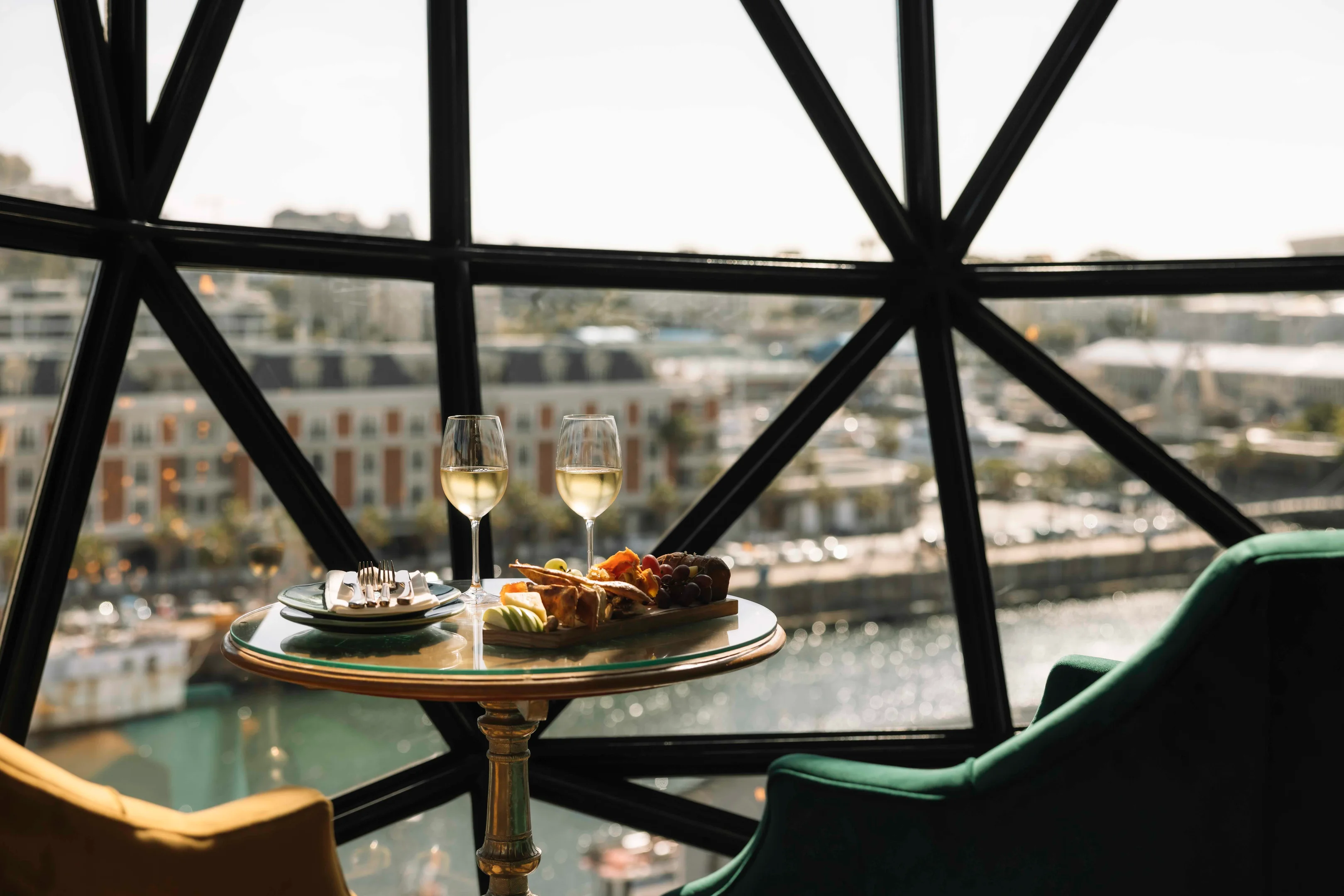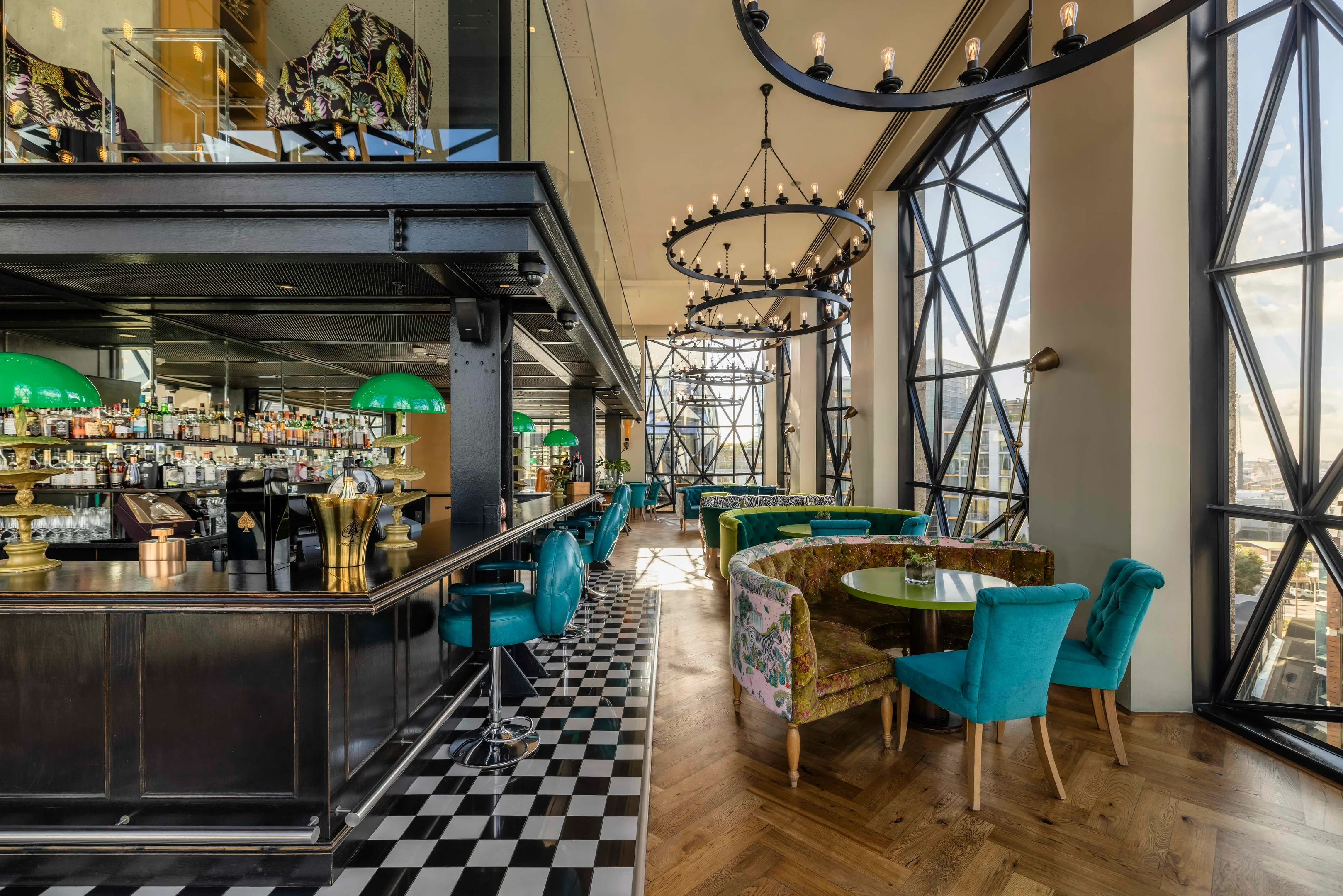 Die Bar greift diese architektonische Sprache auf: hohe Räume, außergewöhnliche Fensterformen und ein farbenfrohes Interior schaffen eine fast galerieartige Atmosphäre. Kunstwerke, Samtstoffe und intensive Farben prägen den Raum, während der Blick auf den Hafen von Kapstadt eine spektakuläre Kulisse bildet. Die Willaston Bar wirkt wie eine Mischung aus Kunstsalon und Lounge – ein Ort, an dem Design und Aussicht gleichberechtigt nebeneinanderstehen.