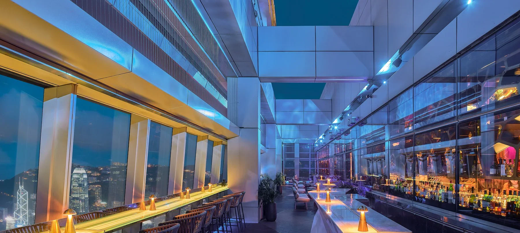 Das Design spielt mit Licht, Geometrie und Struktur. Wabenartige Formen ziehen sich durch Decken und Wände, LED-Elemente setzen Akzente und lassen die Bar fast wie eine digitale Landschaft erscheinen. Der Blick auf die Skyline von Hongkong verstärkt diese Wirkung zusätzlich. Die Ozone Bar ist weniger klassischer Salon als vielmehr ein Erlebnisraum – ein Ort, an dem Architektur, Technologie und Atmosphäre zu einer spektakulären Einheit verschmelzen.