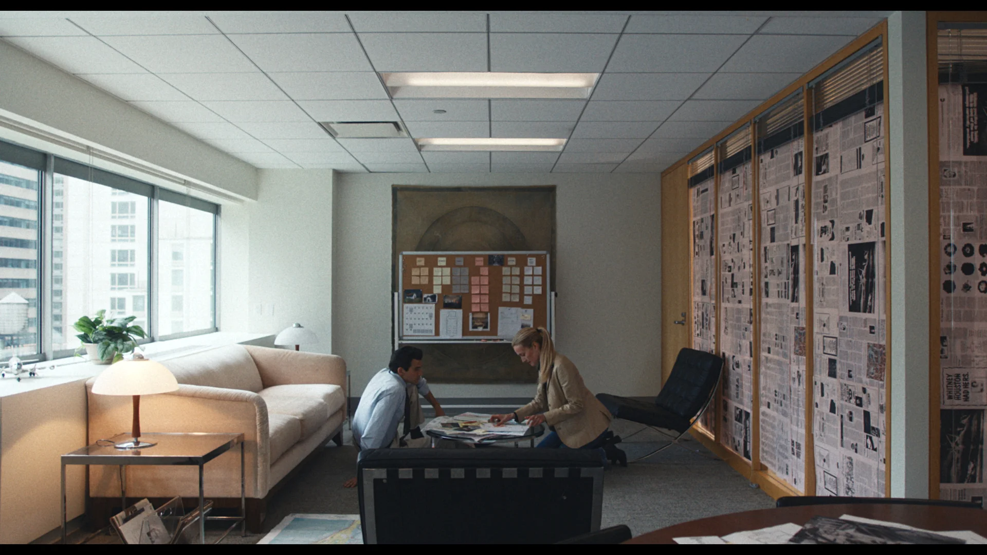 Das Ergebnis sind Räume mit dezenten Wänden, klaren Linien und gezielt platzierten Vintage-Objekten. Die schwarze Stehleuchte etwa ist ein Original von Fortunym, identisch mit dem Stück in Kleins realem Büro. Und Kleins persönlicher Schreibtisch, ein runder Marmortisch mit verchromten Rollen von D'Urso, war laut DiGerlando exakt nachzubauen: „Viele der dortigen Einrichtungsgegenstände, darunter auch der Tisch, waren von D'Urso designt, und wir konnten genau die gleichen finden."