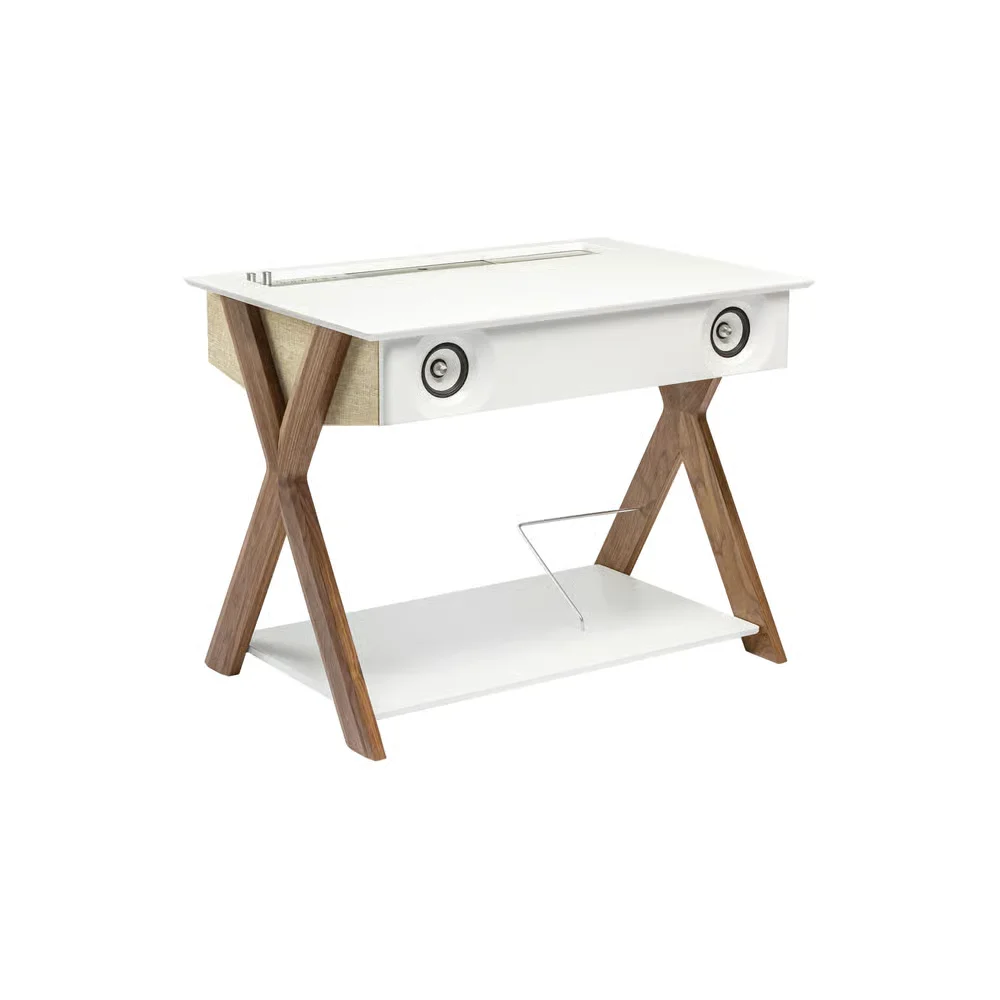 Die fonetta° verbindet traditionelle Materialkultur mit moderner Linienführung. Holz und Metall stehen in ausgewogener Harmonie, als wäre das Objekt einer zeitlosen Möbelkollektion entsprungen. Die Oberflächen wirken handwerklich veredelt, die Proportionen präzise durchdacht.