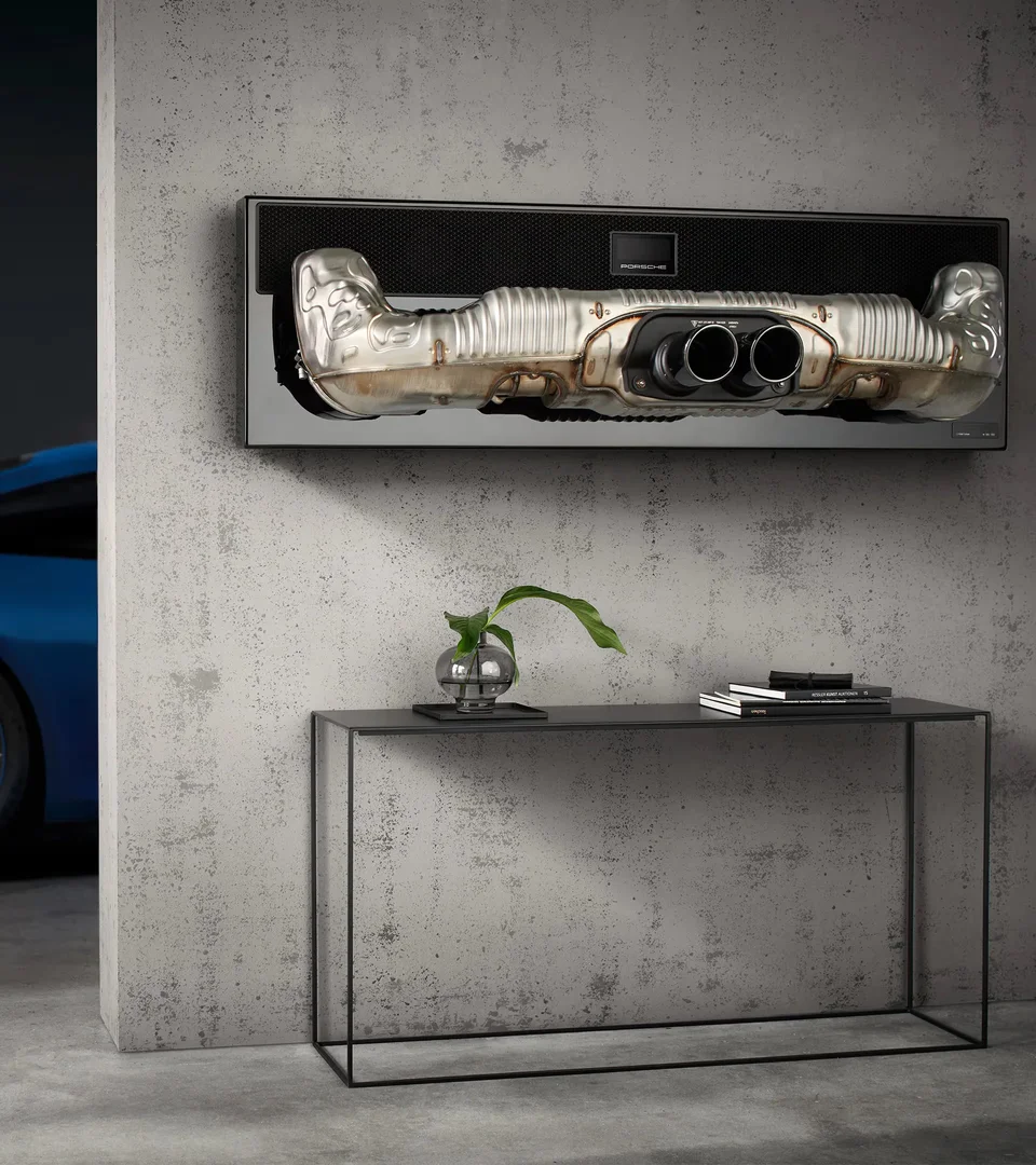 Die 911 Soundbar 2.0 Pro erhebt technische Präzision zum ästhetischen Statement. Die originale Abgasanlage eines Porsche 992 GT3 wird hier zum visuellen Kernstück – roh, metallisch, ikonisch. Die Formensprache folgt der Welt des Motorsports und bringt ihre Energie direkt in den Wohnraum.
