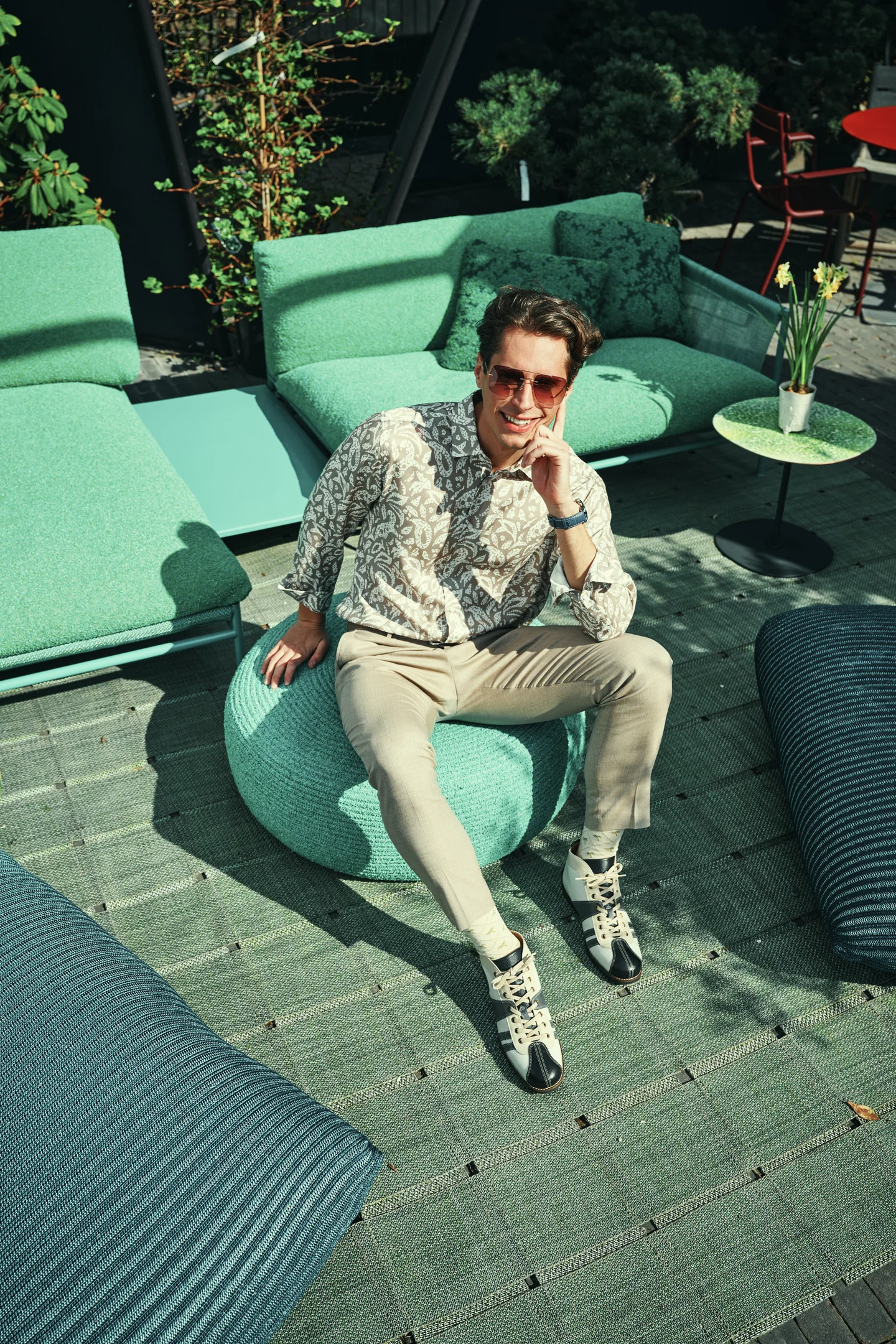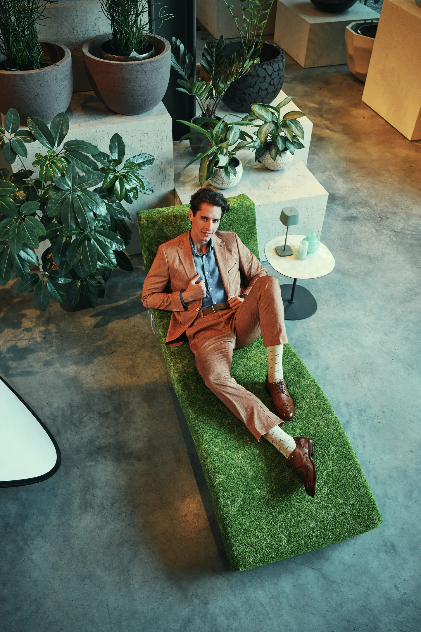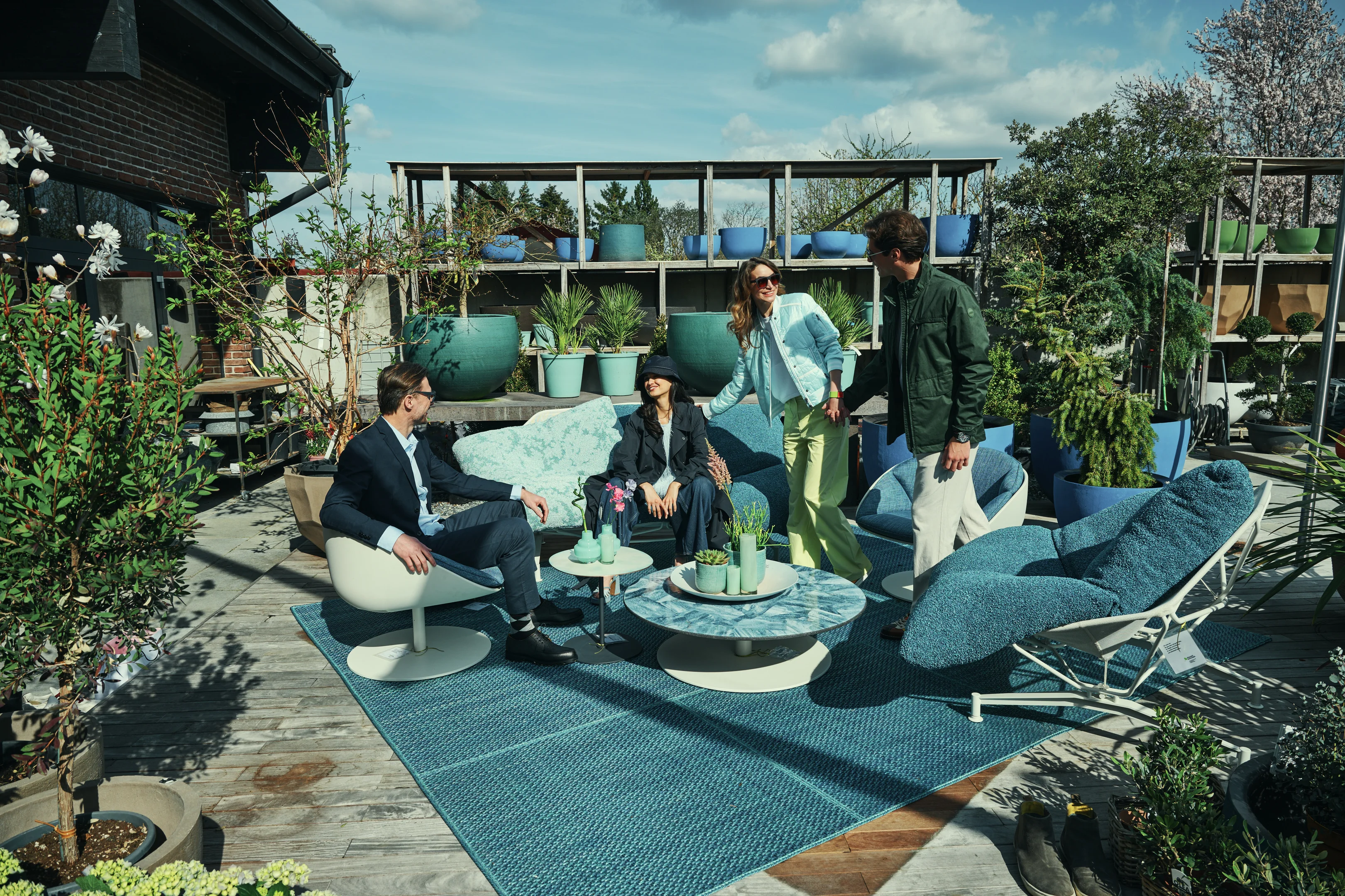 Das Setting weitet sich zu großzügigen Ruhezonen aus: Die Lounge „Alma“ und der charaktervolle Drehsessel „Amable“ laden zum Verweilen ein, während die Beistelltische „Strap“ und „Giro“ funktionale Eleganz beisteuern. Sanfte Untergründe wie der Teppich „Naxos“ oder das Modell „Zoe“ schaffen dabei eine fast wohnzimmerartige Intimität unter freiem Himmel.