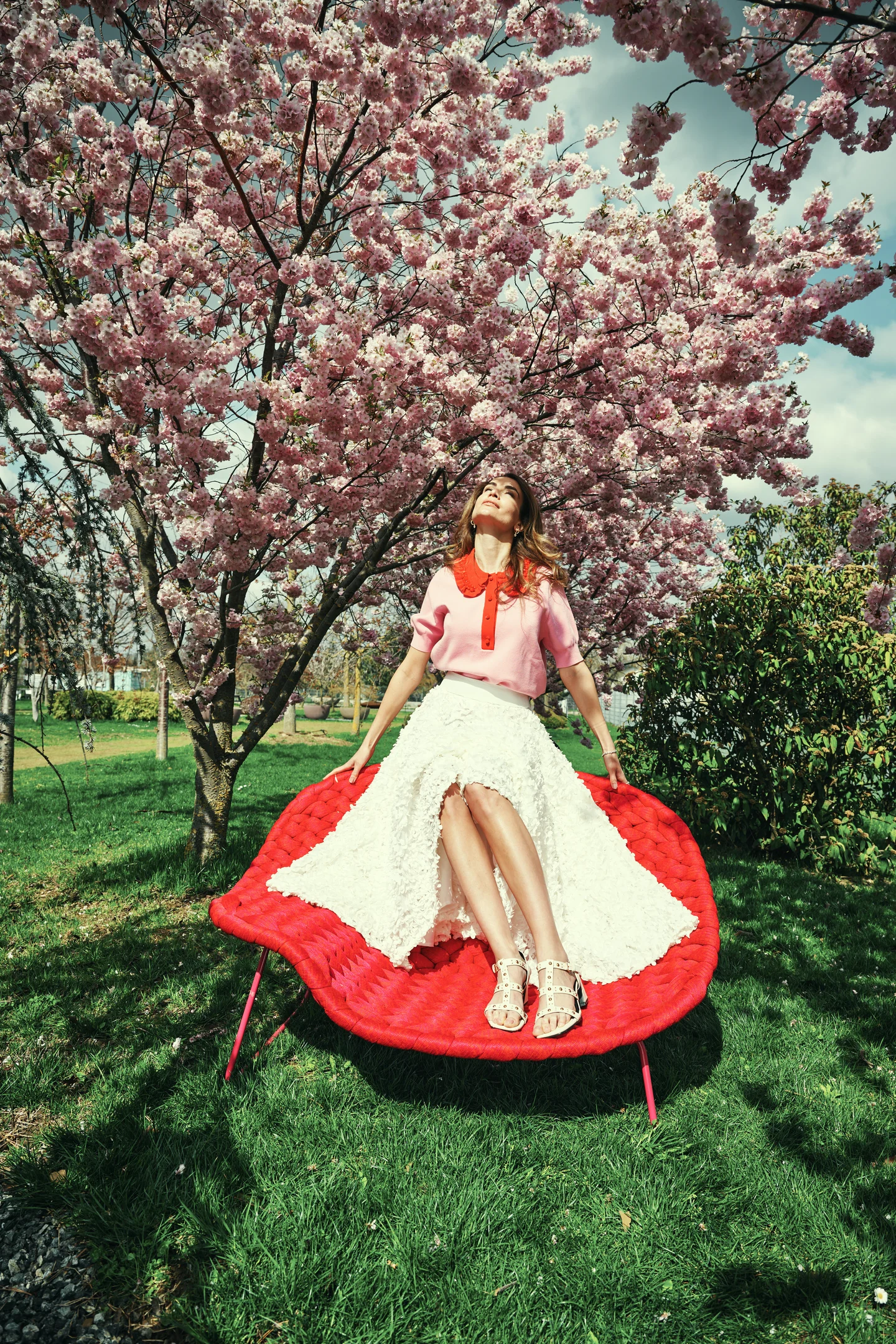 Die Bilderstrecke führt durch verschiedene Wohnlandschaften im Freien, die durch die unverkennbare Handschrift von Paola Lenti geprägt sind. Den Auftakt machen markante Sitzobjekte wie der filigrane Lounge Chair „Telar“, der im Zusammenspiel mit den leuchtenden pinken Keramiktöpfen von Domani einen modernen Farbakzent setzt.