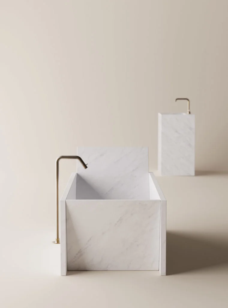 Ohne Gegensätze geht es auch im Badezimmer nicht. Möbel, Böden und Wände aus Holz sowie Tapeten mit floralen und grafischen Mustern erfüllen das. Besonders Echtholz und Oberflächen in Holzoptik finden verstärkt ihren Weg in den Badraum. Zahlreiche Techniken und Materialien zur wasserfesten Imprägnierung machen das jetzt sehr einfach möglich. Der nachwachsende Rohstoff ist zudem nachhaltig und findet darum sowohl als Wandverkleidung, als Boden oder als Waschbecken seinen Platz in der Gestaltung. Beliebt ist (wieder) Marmor in besonders großen Flächen. Kaum verwunderlich, denn quasi fugenlose Flächen schaffen Ruhe und ücken die natürliche Farbgebung des Steins in den Vordergrund. Marmor funktioniert aber auch als Badewanne. Die Wahl des Materials war für Gestalter Jean Nouvel und Agape für die neue Serie Face à face von grundlegender Bedeutung. Hier spielen Natürlichkeit, Geschichte, geometrische Präzision und Schönheit zusammen. „In den Innenbereichen meiner Architektur ist das Badezimmer ein sehr bedeutender Raum. Die Positionierung der Badewanne spielt hier die wichtigste Rolle. Selbst in den kompliziertesten Installationen sollte man sie frei stehen lassen, wie ein Schiff auf See“, so Nouvel über seine Kreation.