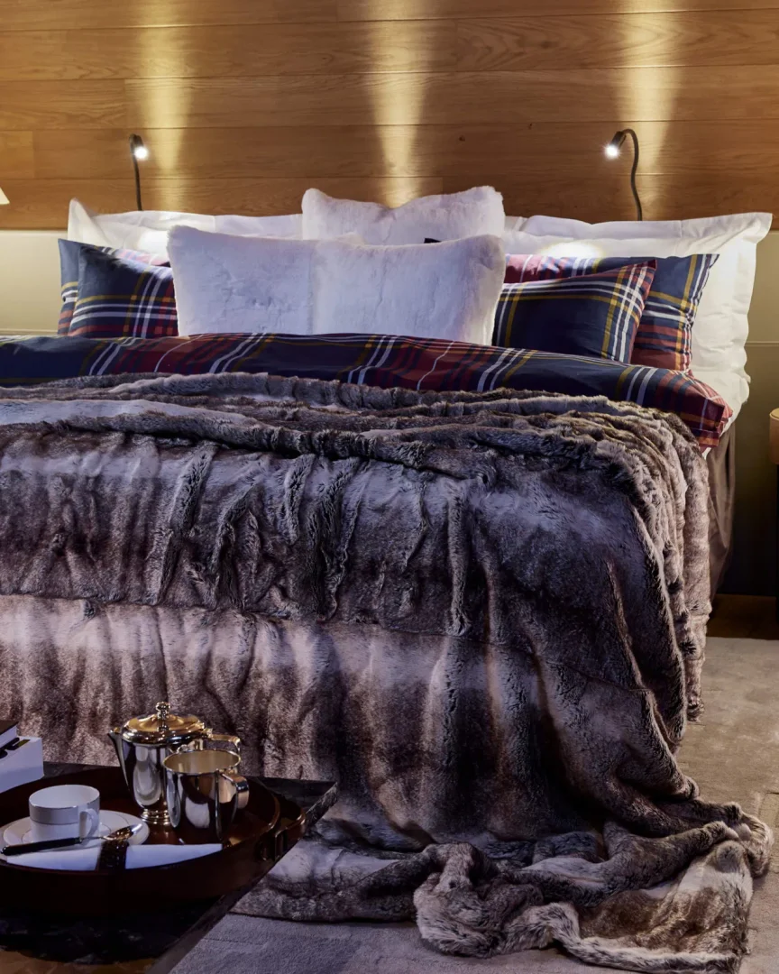 Im Chalet-Look spielen Textilien eine große Rolle: Sie dämpfen Schall, schaffen visuelle Tiefe und machen Räume behaglich.