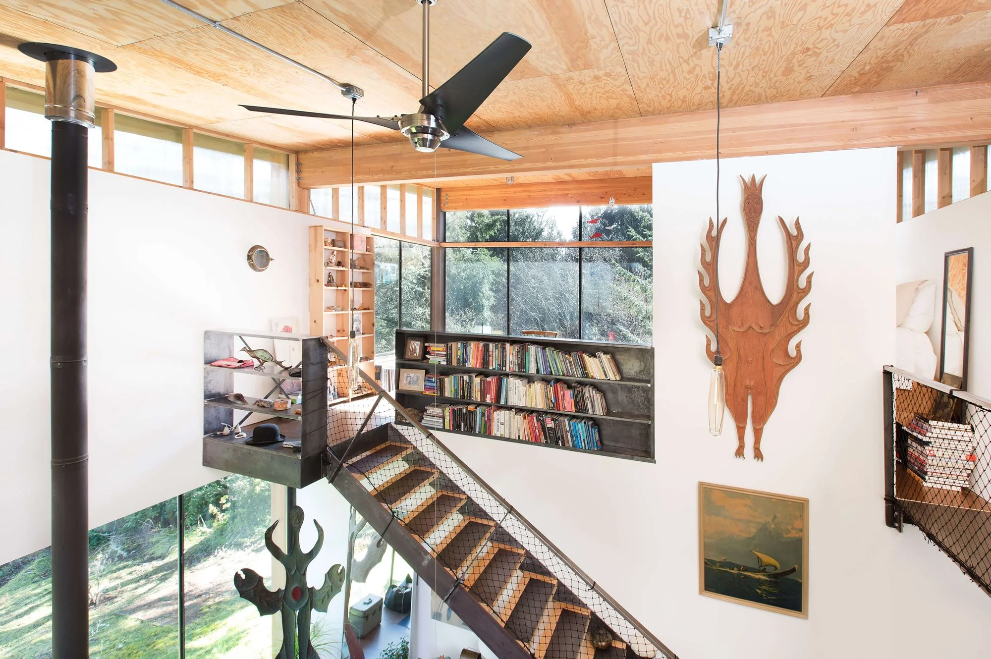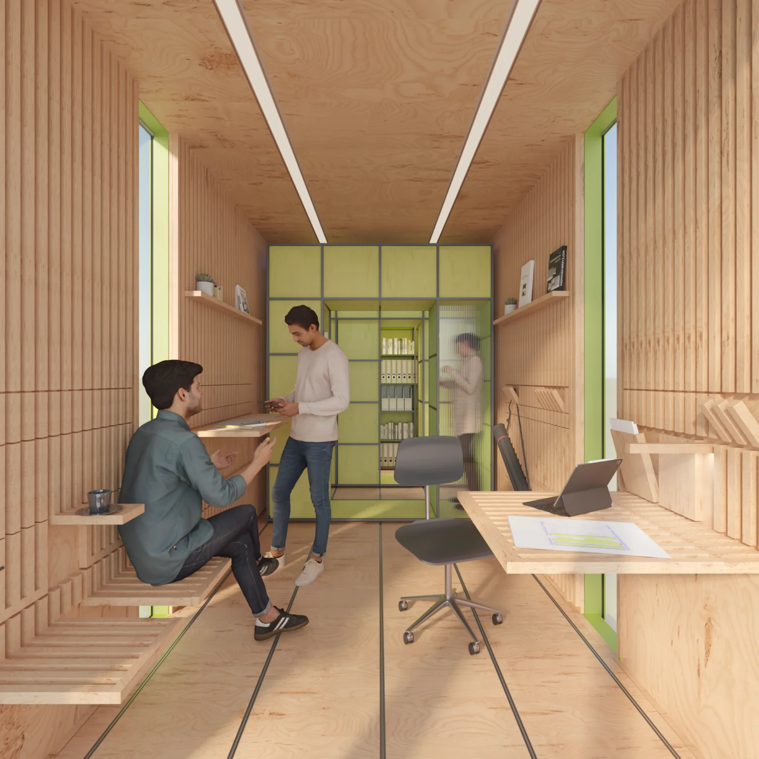 Das Scavenger Studio in Washington zeigt, dass Re-Use auch eine explizite Bauherrenhaltung sein kann: Die Auftraggeberin verlangte, maximal viel frei verfügbares Material einzusetzen. Schränke und Holzelemente stammen aus Abrissbauten. Das Ergebnis ist kein rustikaler Flickenteppich, sondern ein bewusst gestaltetes Interieur, das seine Herkunft zeigt – und daraus Charakter bezieht.