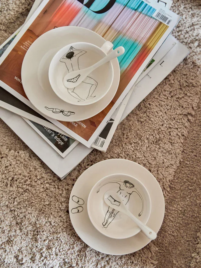 Das Undressed Kaffeetassen Set von Polspotten setzt auf handbemalte Details und feine Farbverläufe. Die Kombination aus Tassen, Untertassen und Löffeln sorgt für ein harmonisches Gesamtbild und macht den Frühstückstisch zu einem kleinen Design-Highlight.
