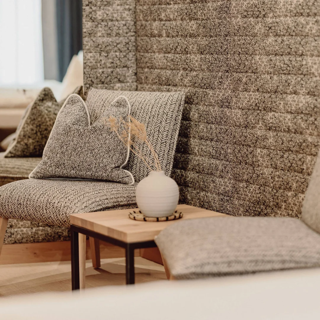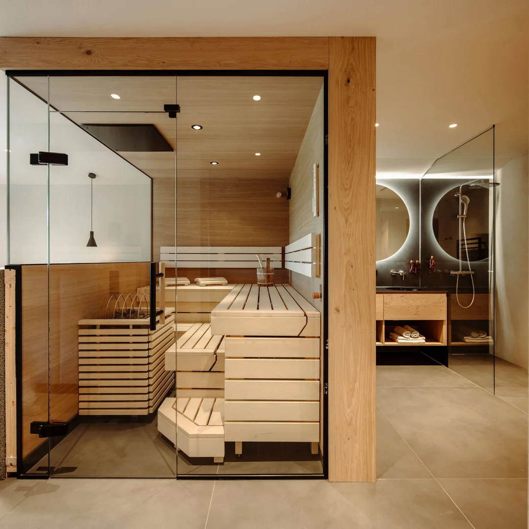 Das Alpina liest sich übrigens fast wie ein geschnittener Turm: Unten Ankunft, Skikeller und Gondel-Anbindung als Transitzone; darüber Zimmertrakte mit Holzböden und Privatsphäre; mittig das 2.000 m²-Spa auf zwei Ebenen; ganz oben der Infinity-Rooftop-Pool als Schlusspointe mit Weitblick. Jede Etage verändert Licht, Geräuschniveau und Dichte – vom Trubel der Lobby zur leichten Panoramabühne. Diese Dramaturgie antwortet auf Hanglage und Ganzjahresnutzung: Sommercard-Vorteile (Golf, Wandern) und Wintersport (Tennis, Pilates) erfordern dichte, vertikale Organisation.