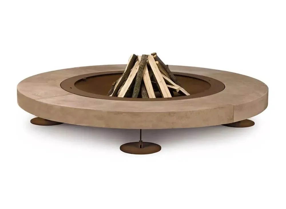 Die Feuerschale aus Edelstahl von Ricon wirkt auf den ersten Blick wie ein klassisches Element, doch ihre Größe und Materialwahl geben ihr einen eindrucksvollen Charakter. Mit einem Durchmesser von einem Meter dominiert sie den Außenbereich und lädt dazu ein, sich im Kreis um die knisternden Flammen zu versammeln. Ihre oxidierte Oberfläche verleiht ihr eine rustikale Patina, die mit der Zeit noch an Charme gewinnt. Gerade im Kontrast zu klar strukturierten Gärten oder modernen Terrassen entfaltet die Feuerschale ihre Wirkung als monumentales Zentrum – eine Mischung aus rauer Ursprünglichkeit und langlebiger Eleganz.