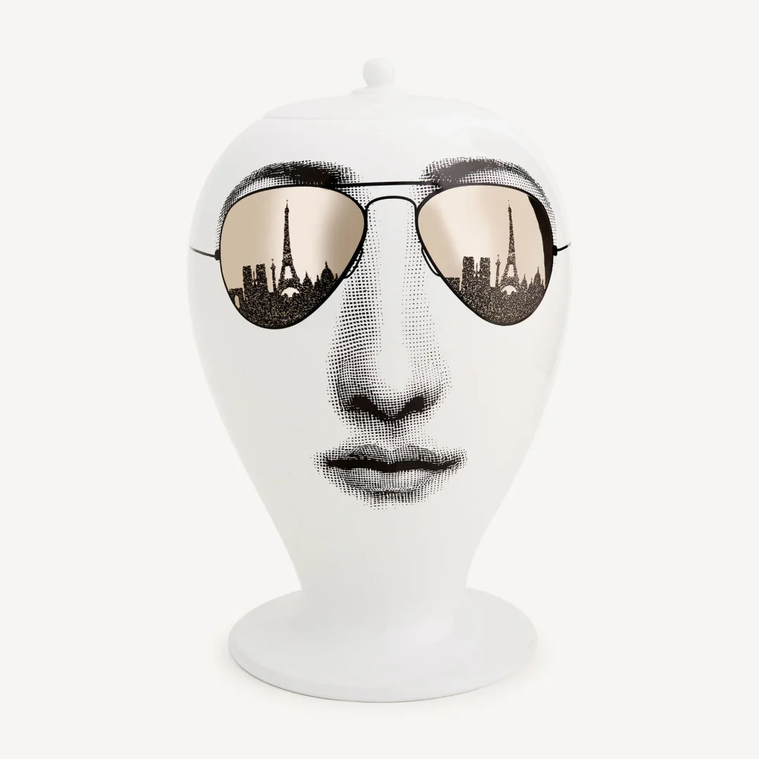 Mit der Vase Paris Tour setzt Fornasetti auf ikonische Bildsprache und klare Kontraste. Der Eiffelturm, reduziert auf Schwarz, Weiß und feine Platinakzente, verwandelt die Vase in ein grafisches Kunstobjekt mit starkem Wiedererkennungswert.
