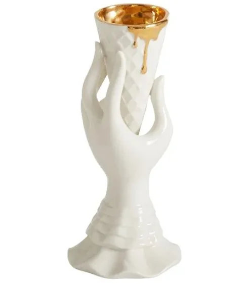 Die Gilded I Scream Vase von Jonathan Adler ist ein echtes Statement-Piece. Mit ihrem goldenen Eis-Motiv verbindet sie Pop-Art, Glamour und Humor zu einem Objekt, das sofort Aufmerksamkeit erzeugt.