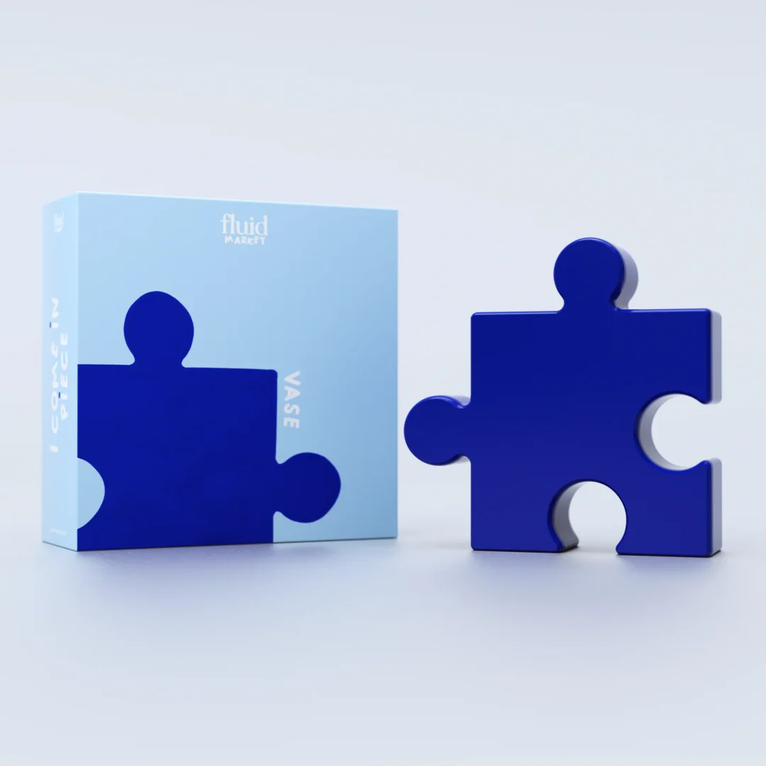 Die Puzzle Bleu Vase von Fluid Market lebt von ihrer ungewöhnlichen, fast spielzeughaften Formsprache. Die geometrische Gestaltung wirkt bewusst unperfekt und erinnert an kreative Baukästen – ein subtiler Verweis auf Spiel und Fantasie.