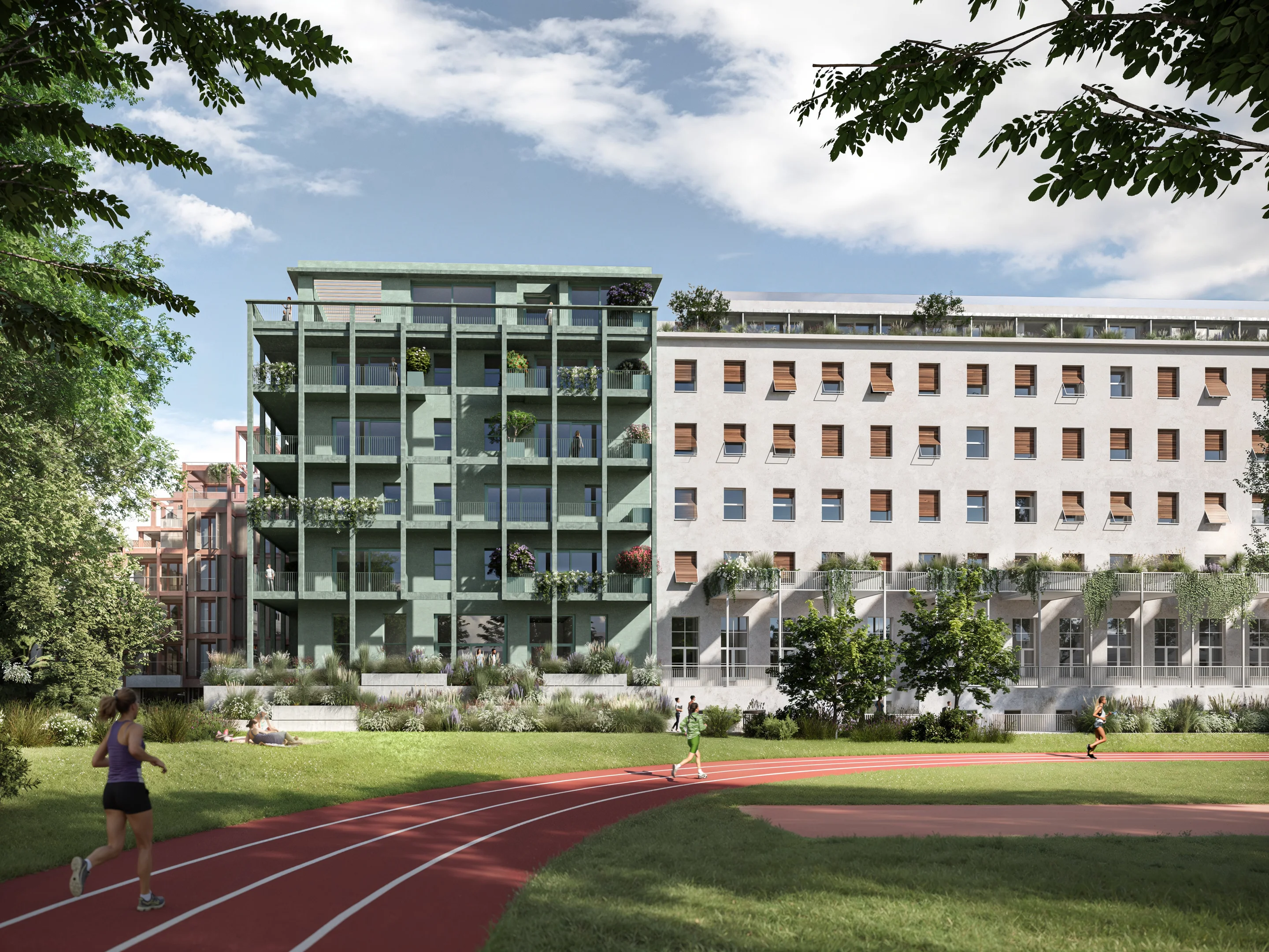 Der Neubau am Gelände steht exemplarisch für zukunftsweisendes Bauen: Die Holz-Hybrid-Konstruktion in CREE-Bauweise kombiniert vorgefertigte Module aus Holz, Beton oder Stahl und ermöglicht dadurch eine rasche, emissionsarme Bauweise. Ein Geothermie-Sondenfeld sowie Photovoltaikanlagen sorgen für effizientes Heizen und Kühlen. Neben einem klaren Bekenntnis zu nachhaltigem Bauen überzeugt der Neubau auch mit großzügigen Freiflächen – von Eigengärten im Erdgeschoss bis zu sonnigen Dachterrassen – und einer hauseigenen Tiefgarage.
