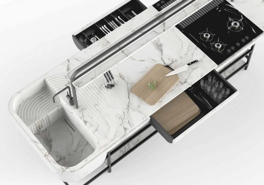 CO/CO is cooking in company! Mit dem Stein-Küchenblock CO/CO von Breitwieser STONE ist alles möglich. Der Grundgedanke des Entwurfs geht auf die elementare Notwendigkeit beim Kochen ein: Wasser, Feuer und eine große Arbeitsfläche.